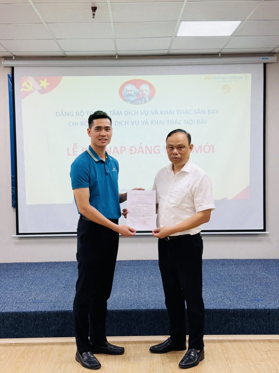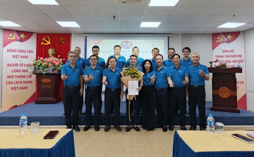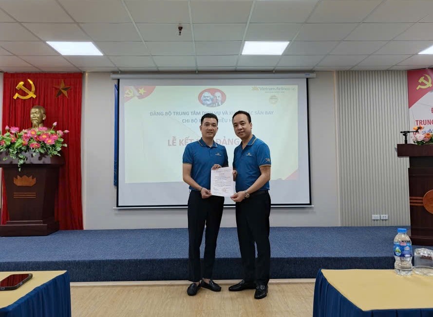 Tại Chi bộ Phòng Dịch vụ và Khai thác Nội Bài, đồng chí Nguyễn Hồng Thái – Phó Bí thư Chi bộ công bố và trao Quyết định kết nạp Đảng viên cho quần chúng ưu tú Đỗ Tuấn Dương.
