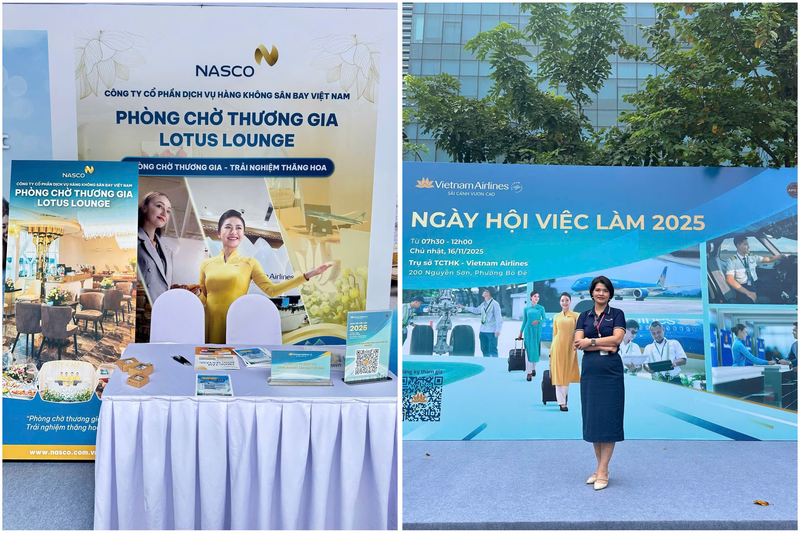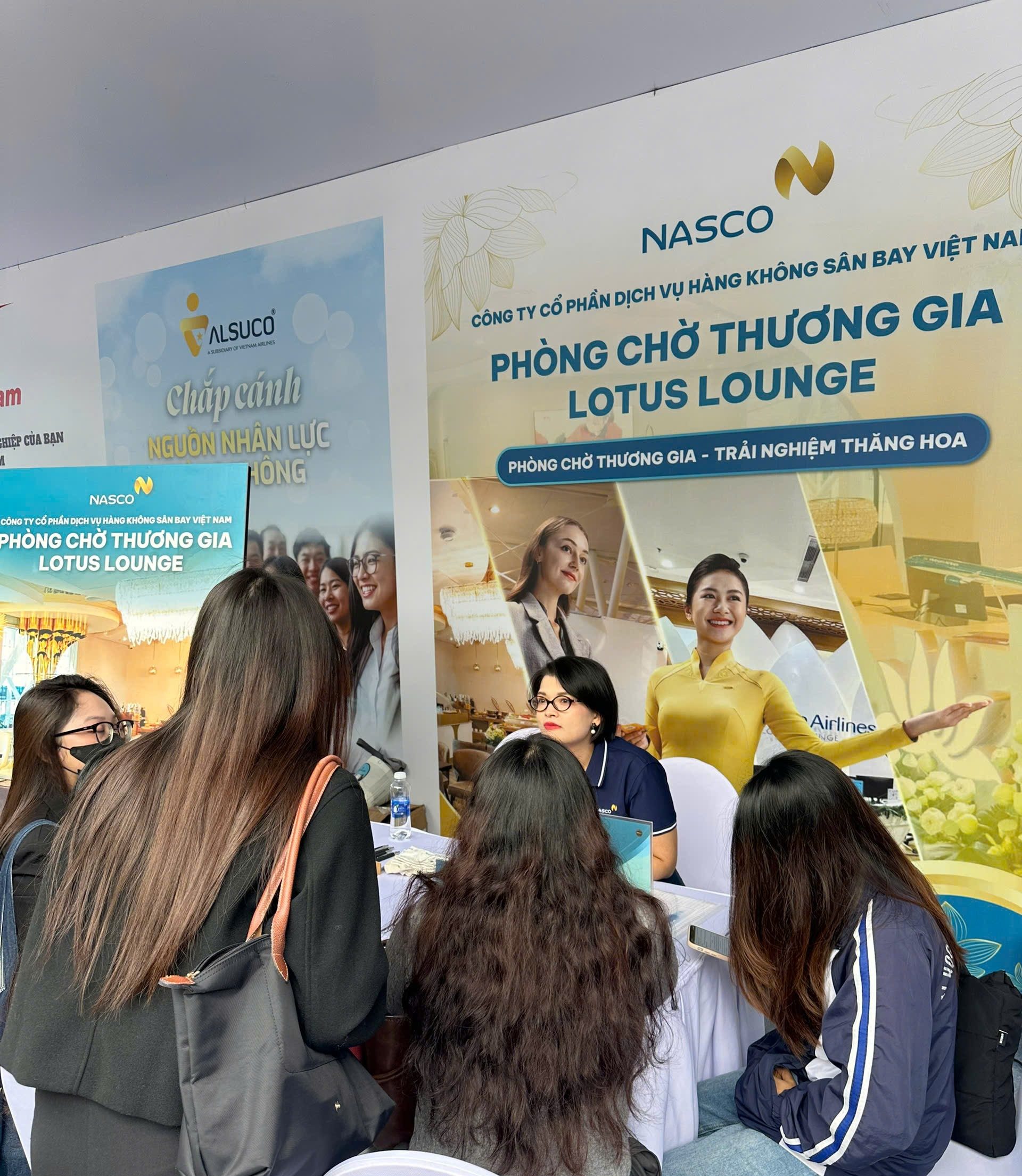Tại gian hàng của NASCO, đội ngũ tư vấn tuyển dụng giới thiệu nhiều cơ hội việc làm thuộc nhóm nhân viên dịch vụ tuyến đầu phục vụ hành khách như nhân viên lễ tân, nhân viên đón tiễn hành khách, nhân viên phục vụ khách hàng, cũng như những thông tin về dịch vụ phi hàng không tại sân bay. Với những vị trí này, ứng viên được rèn luyện kỹ năng giao tiếp, tác phong và khả năng xử lý tình huống linh hoạt trong môi trường chuyên nghiệp.