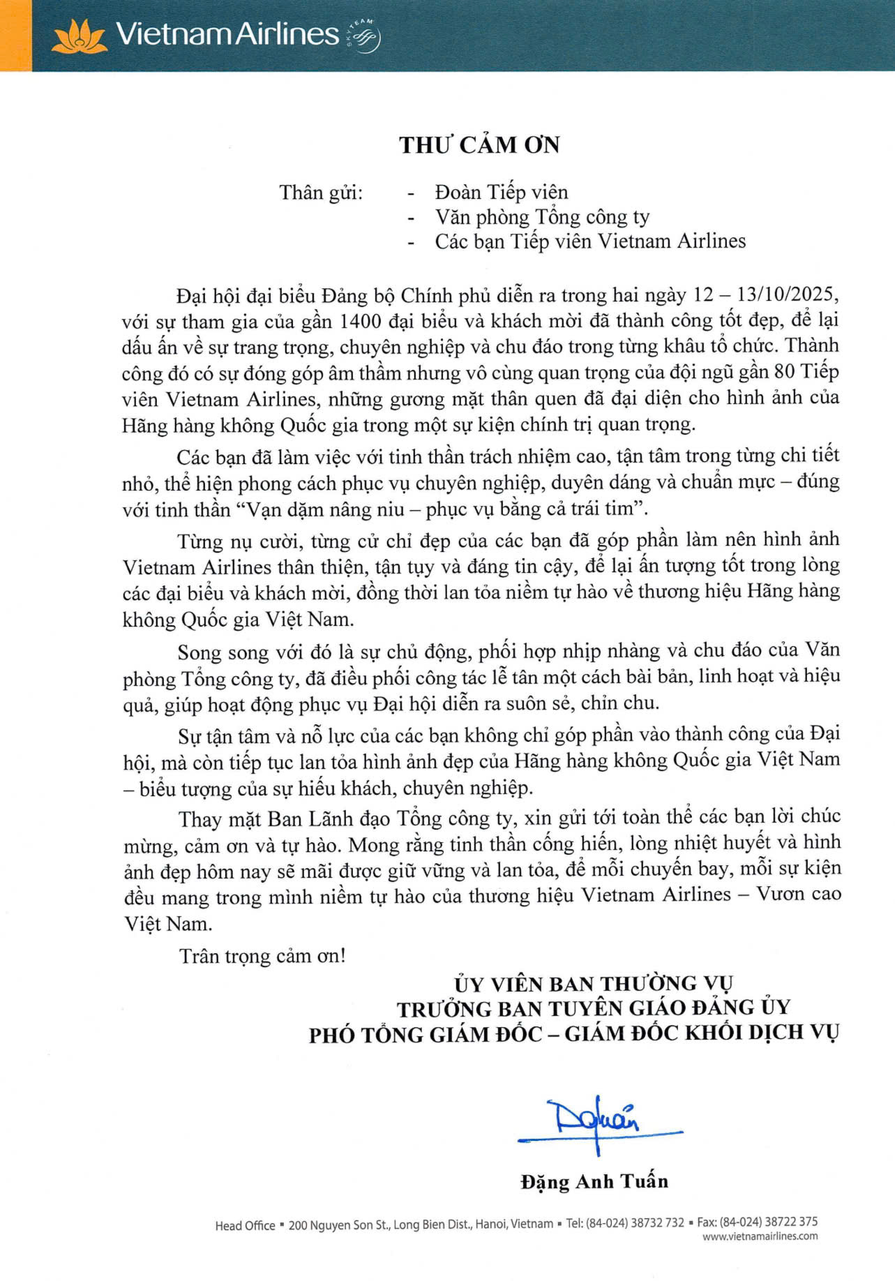Phó Tổng Giám đốc Đặng Anh Tuấn đã thay mặt Ban Lãnh đạo Tổng công ty gửi lời chúc mừng, cảm ơn và tự hào sâu sắc trước những đóng góp quý báu ấy. Ông nhấn mạnh, sự tận tâm và nỗ lực của các cá nhân, tập thể không chỉ góp phần vào thành công của Đại hội, mà còn tiếp tục lan tỏa hình ảnh đẹp của Vietnam Airlines.
