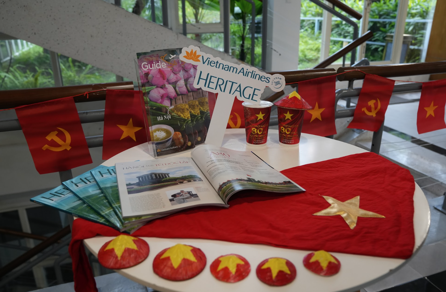Không chỉ trang hoàng không gian làm việc, Tạp chí Heritage còn đặc biệt thiết kế những góc check-in ấn tượng, nơi mọi người có thể lưu lại những khoảnh khắc đáng nhớ trong không khí hân hoan này. Những tiểu cảnh được dựng lên với hình ảnh đất nước, con người Việt Nam tươi đẹp, cùng với biểu tượng của Hãng Hàng không Quốc gia Vietnam Airlines, tạo nên sự kết nối giữa lịch sử hào hùng và sự phát triển của đất nước.