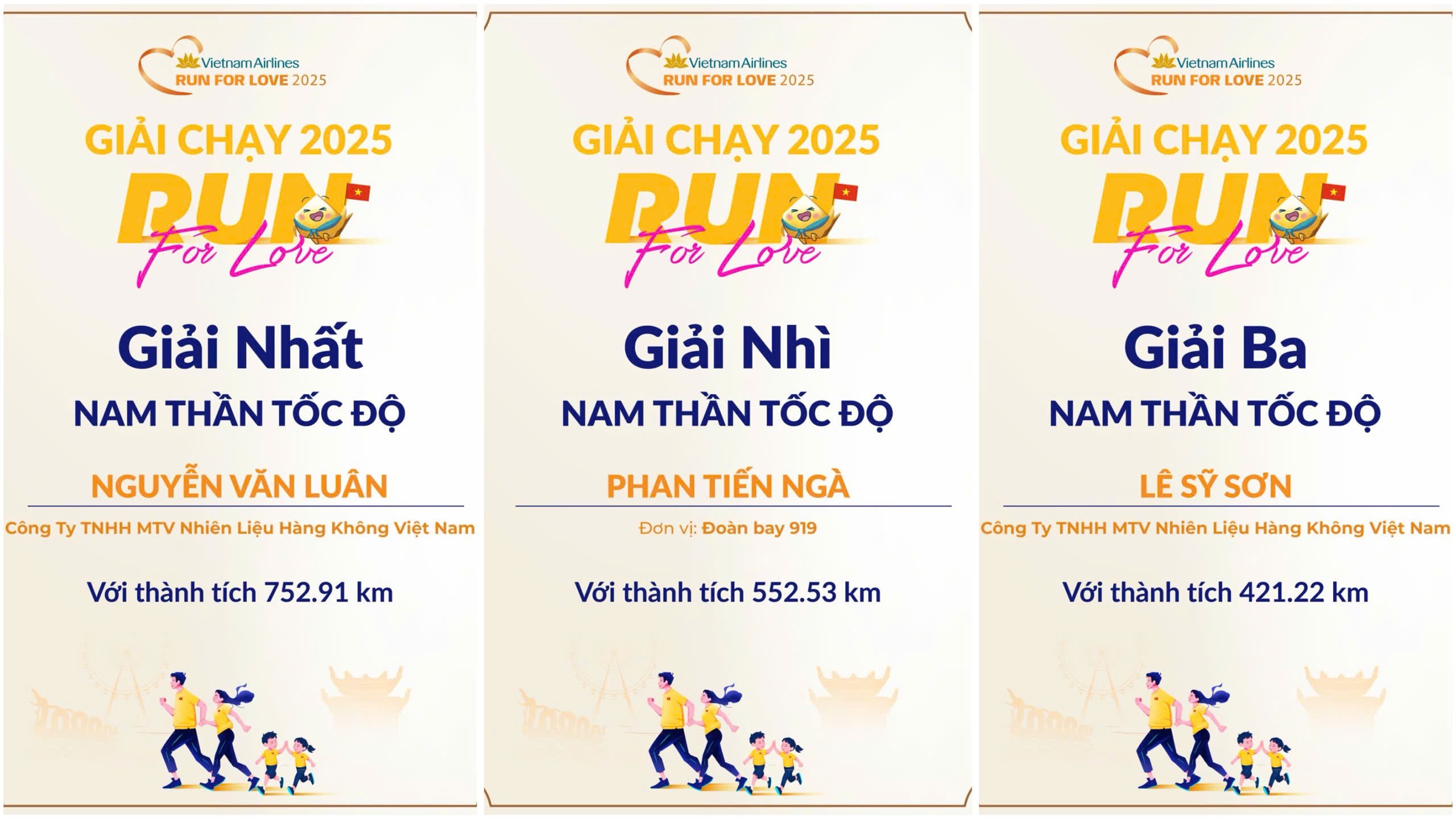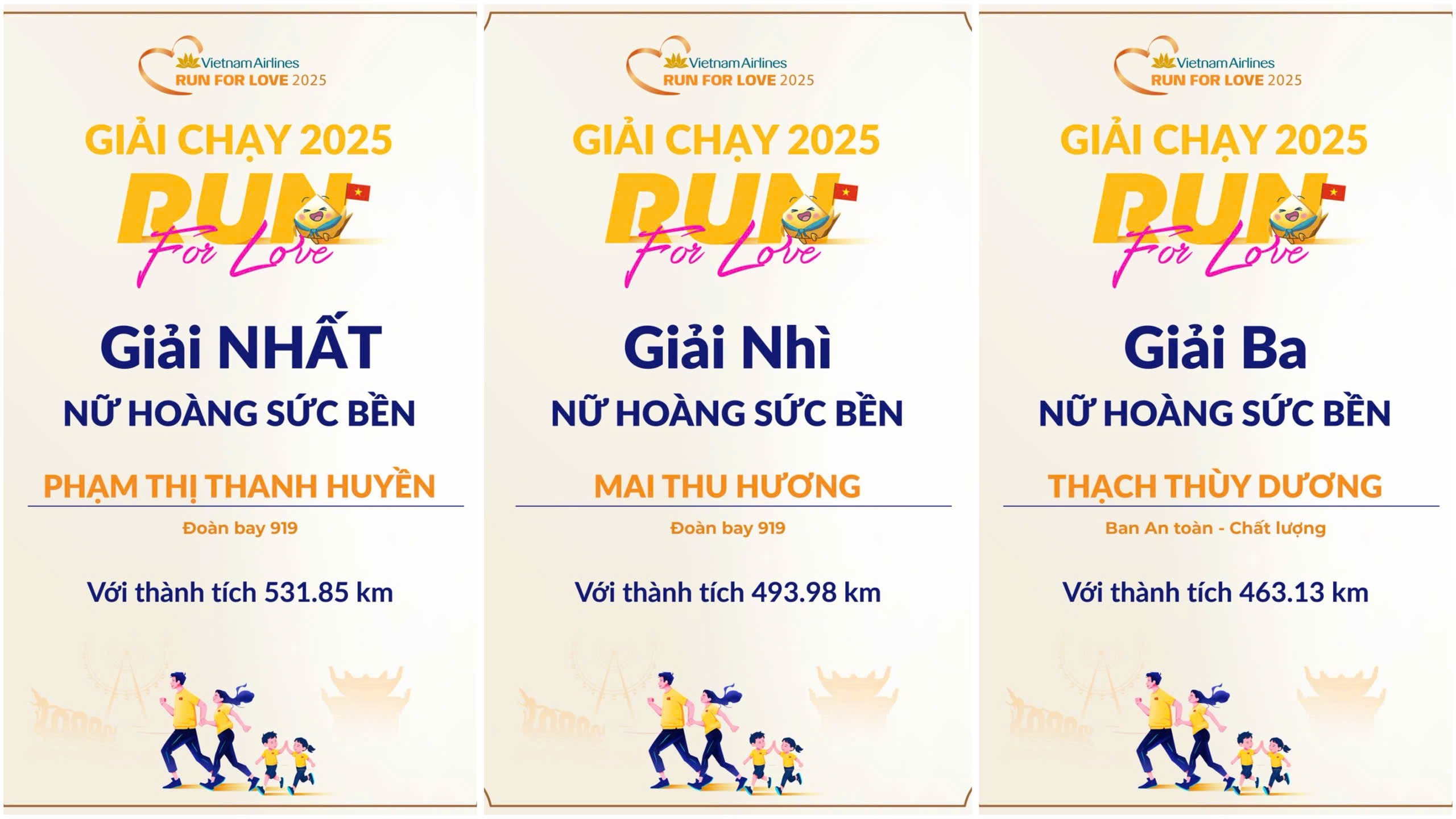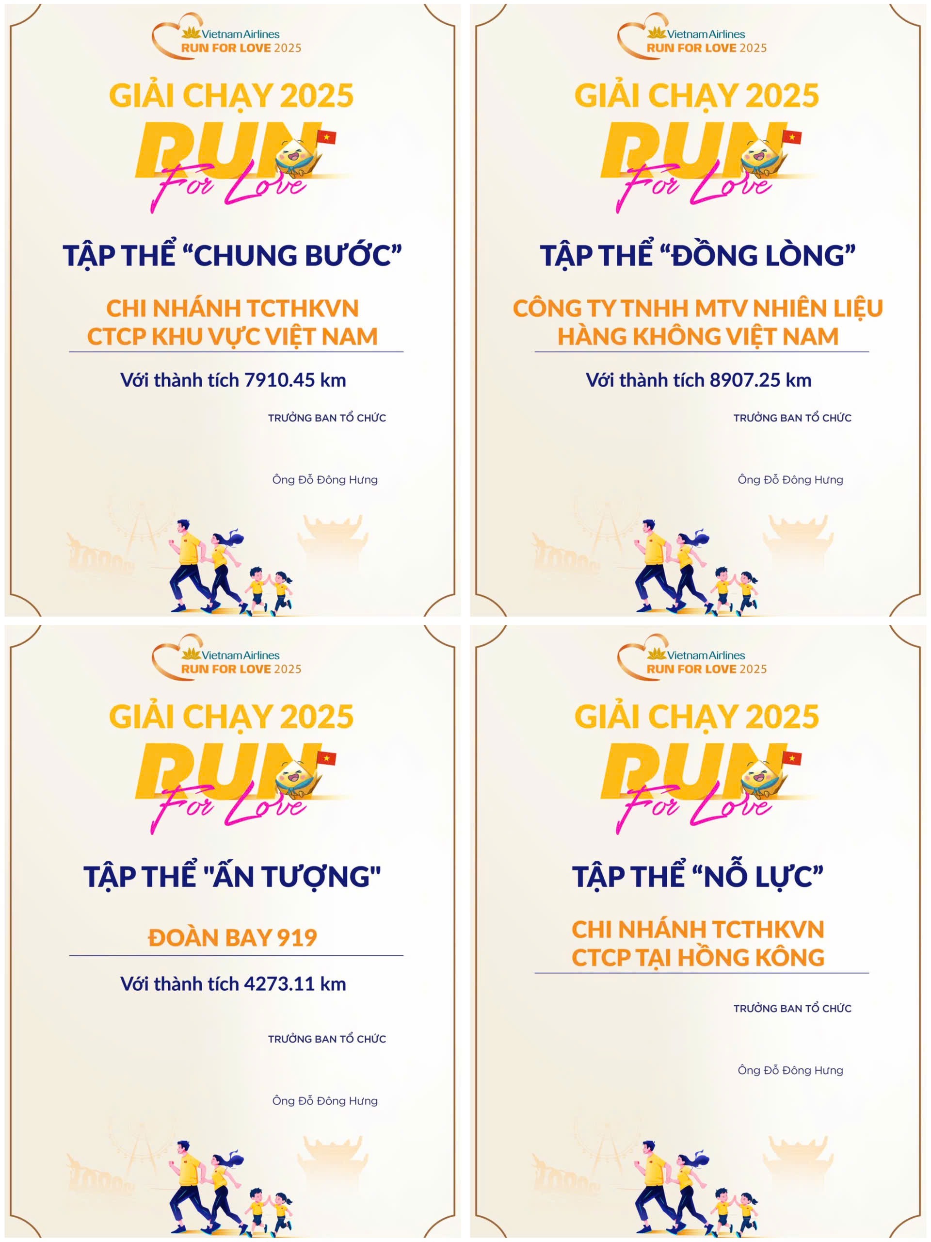Run For Love Online 2025 đã thành công tốt đẹp với sự tham gia của 382 vận động viên (VĐV) từ các đơn vị thuộc Vietnam Airlines Group và các cơ quan liên quan. Với tổng quãng đường 33.395 km, sự kiện đã lan tỏa tinh thần thể thao và đoàn kết giữa các cán bộ, nhân viên của Vietnam Airlines. Đặc biệt, 175 VĐV đã hoàn thành xuất sắc thử thách của Ban tổ chức.
