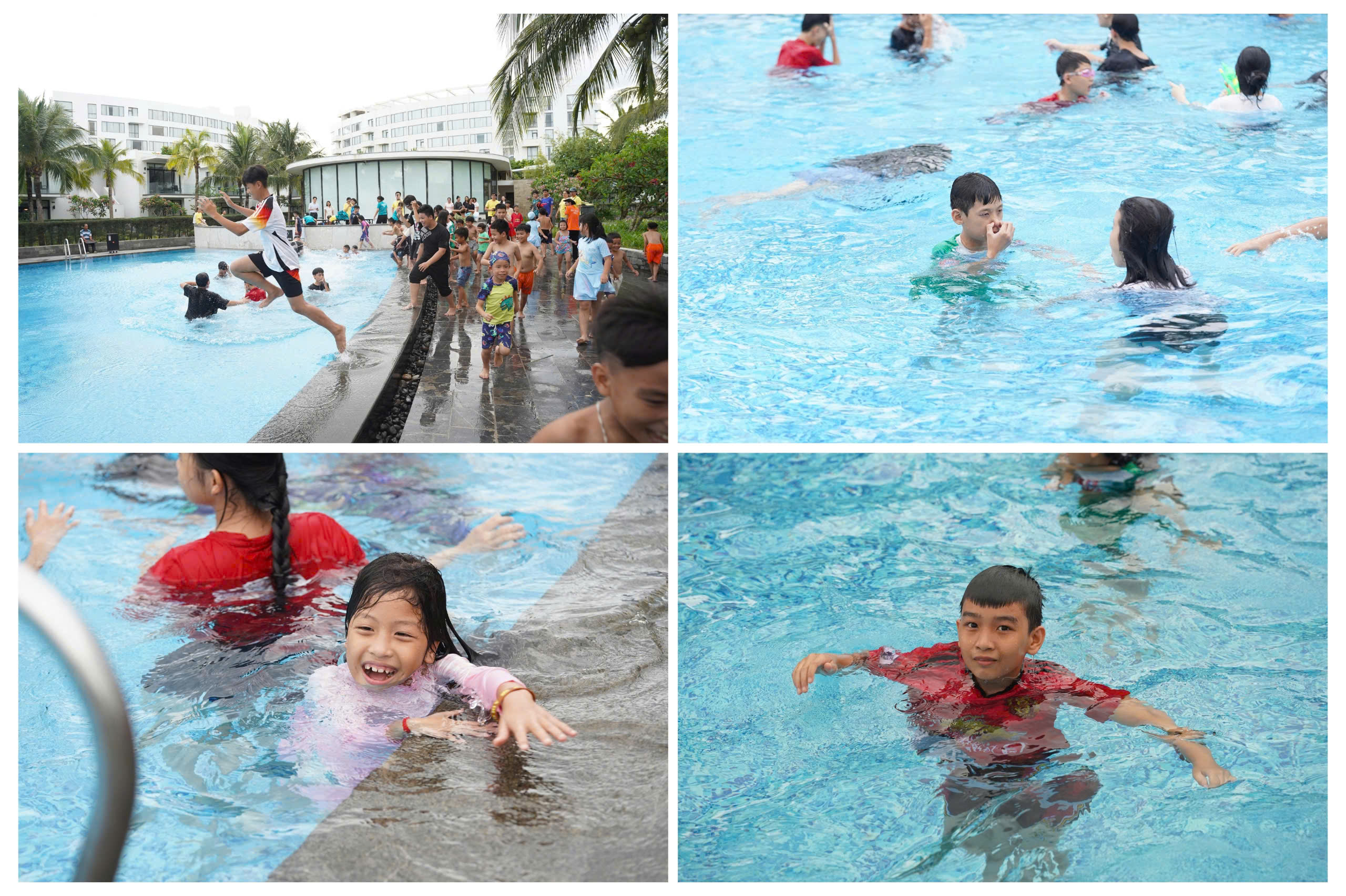 Sau những giờ phút khám phá và học hỏi, các em được thỏa sức vui đùa dưới làn nước trong xanh của khu hồ bơi. Dưới ánh nắng của chiều hè, các bé vui vẻ nhảy múa và bơi lội dưới hồ bơi. Với sự hướng dẫn nhiệt tình của quản trò, các bé không chỉ phát triển thể chất mà còn rèn luyện kỹ năng vận động theo điệu nhạc sôi động.