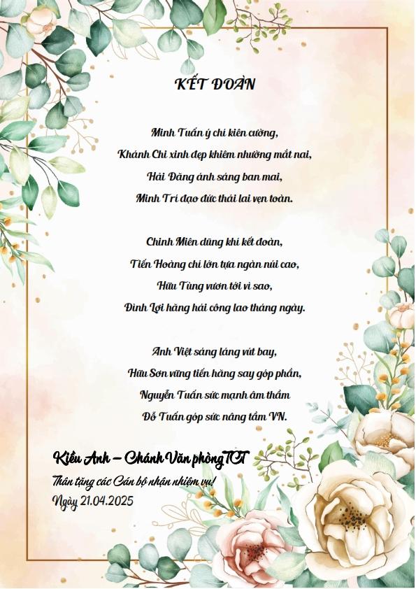 Nhân dịp các cán bộ nhận nhiệm vụ mới, đồng chí Kiều Anh – Chánh Văn phòng TCT, đã gửi tặng một vài câu thơ thể hiện sự động viên và kỳ vọng vào tinh thần cống hiến của các cán bộ. Những câu thơ này không chỉ là lời nhắc nhở về trách nhiệm, mà còn là nguồn động lực để mỗi cá nhân tiếp tục vững bước trên con đường phát triển của Vietnam Airlines.