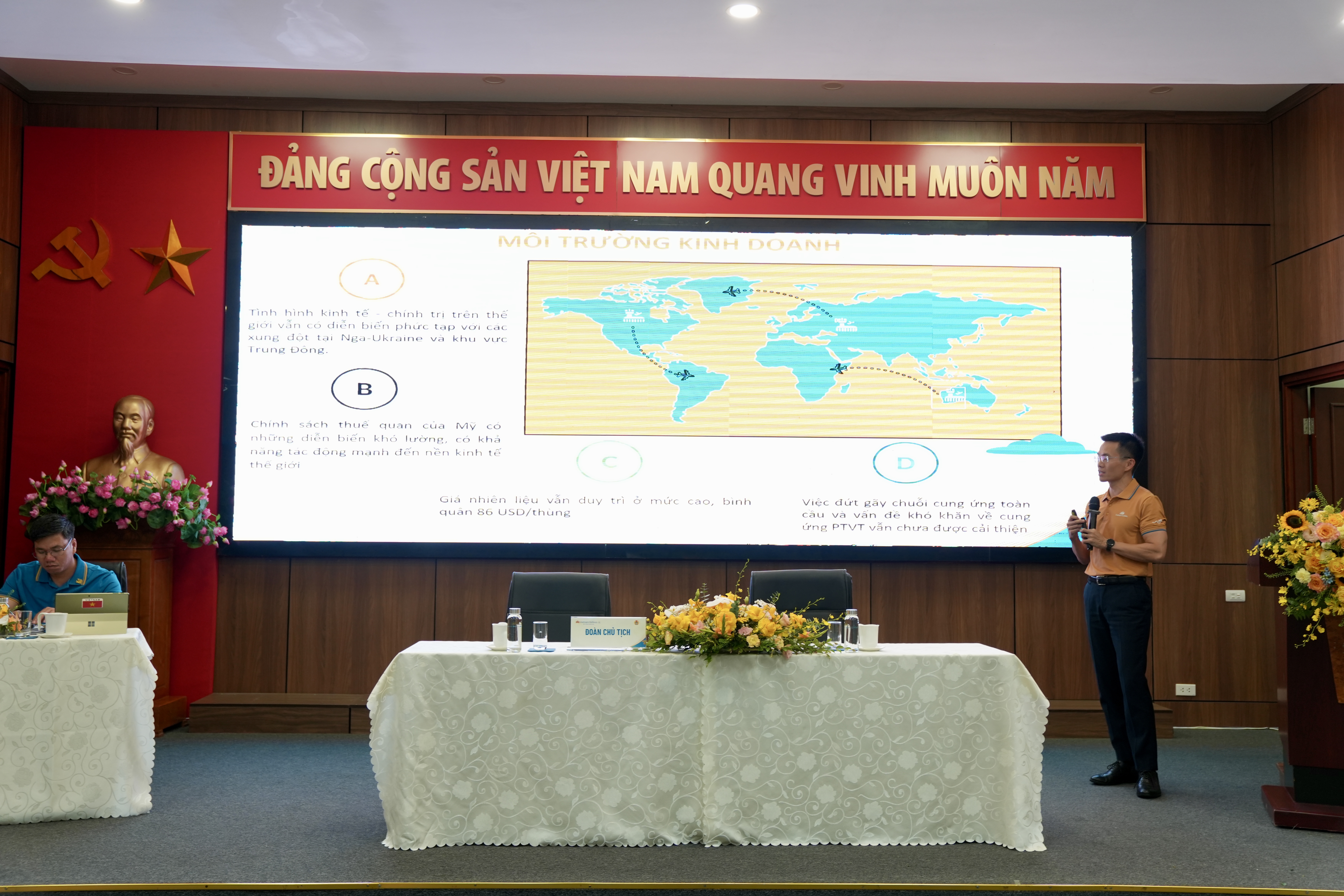 Tại hội nghị, Trưởng Ban Kế hoạch Phát triển Nguyễn Quang Trung báo cáo kết quả kết quả sản xuất kinh doanh 7 tháng đầu năm 2025 và phương hướng, nhiệm vụ những tháng cuối năm của TCT. Theo đó, trong bối cảnh kinh tế – chính trị thế giới nhiều biến động, xung đột khu vực, giá nhiên liệu duy trì mức cao 86 USD/thùng, chuỗi cung ứng chưa phục hồi hoàn toàn, Vietnam Airlines vẫn đạt hiệu quả sản xuất kinh doanh ở mức kỷ lục. Tổng công ty đã nâng cao năng lực quản trị, điều hành sản phẩm – giá – chỗ, tăng doanh thu trên đơn vị cung ứng; tối ưu lịch bay, cải thiện hiệu suất sử dụng tàu bay; đồng thời không ngừng nâng cao chất lượng dịch vụ, giữ vững uy tín trên thị trường quốc tế.