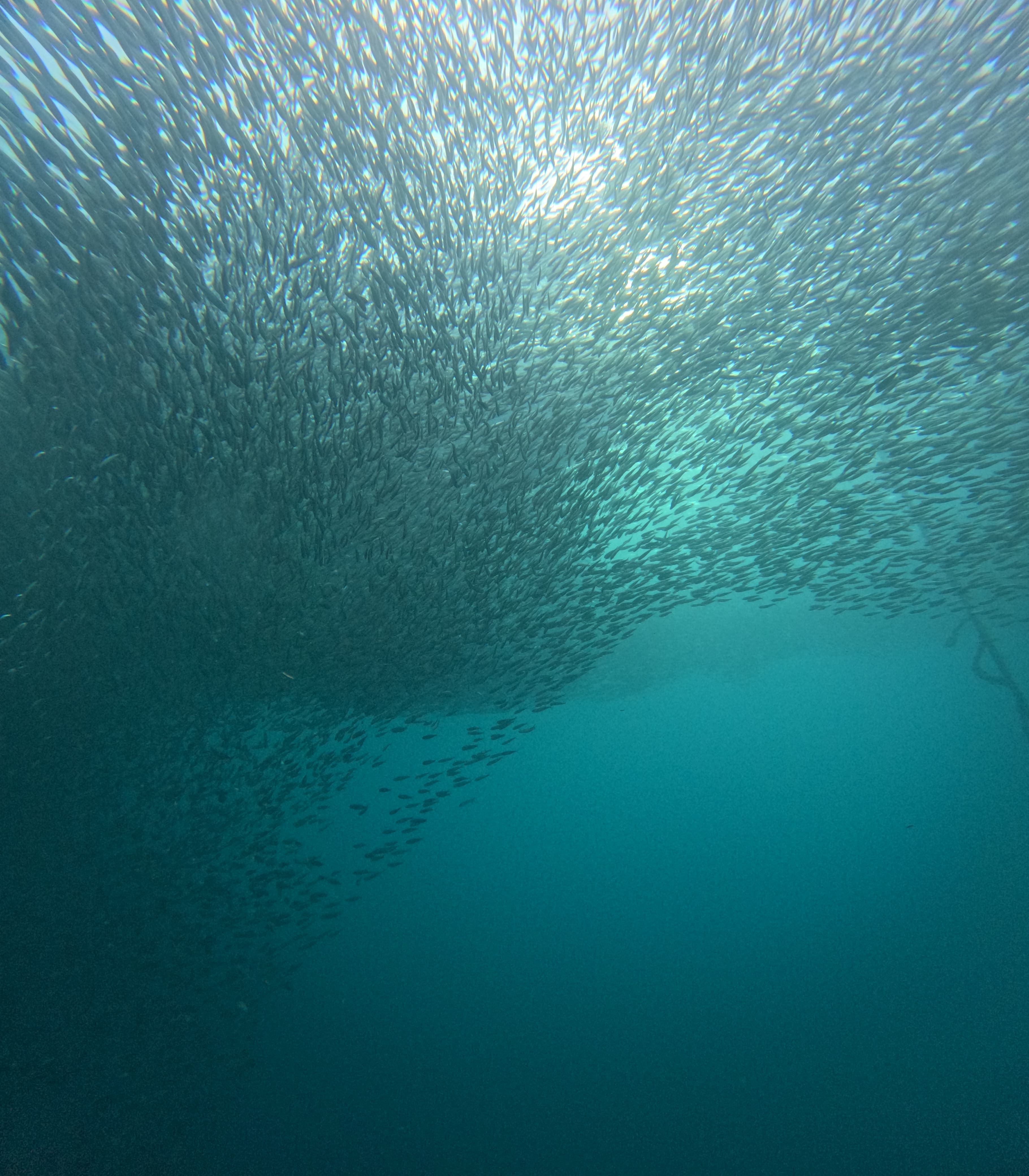 Và “đặc sản” nổi tiếng nhất là đàn cá trích khổng lồ (sardine run). Không cần đi xa, chỉ bơi ra cách bờ vài chục mét là thấy cả triệu con cá cuộn lại thành khối. Khi lặn xuống, ngẩng đầu lên là cả một “đám mây” cá che kín trên đầu. Nếu vô tình lọt vào giữa đàn, bạn sẽ có cảm giác như lạc trong một cơn bão sống động – xoay đâu cũng thấy cá. Một cảnh tượng thực sự ngoạn mục, khiến dân lặn mê mẩn.