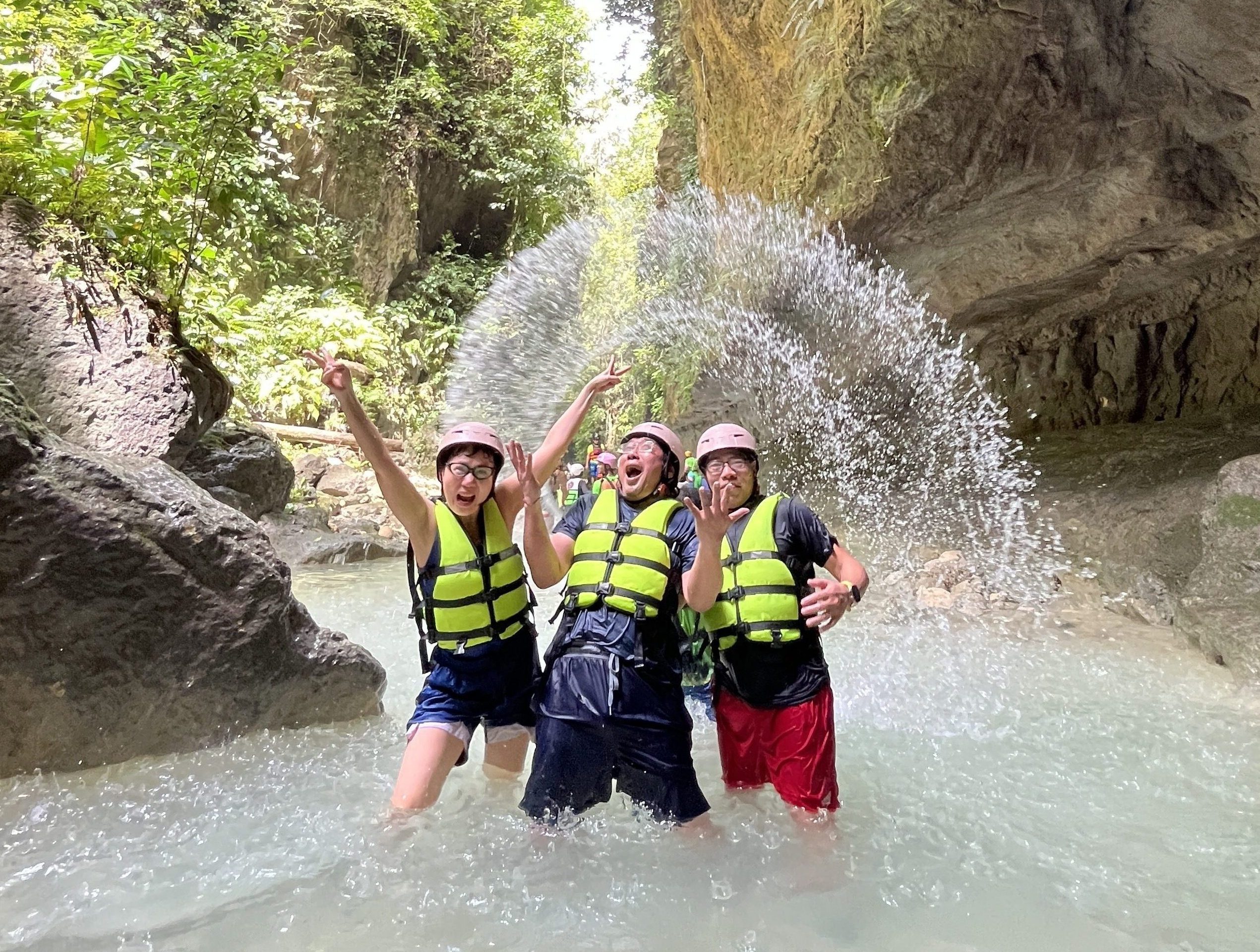 Ngoài lặn biển, Cebu còn có canyoneering ở thác Kawasan – một trải nghiệm rất đáng thử. Trượt thác, trekking, bơi suối, nhảy thác, đu dây… trò nào cũng vui và hơi “thót tim”.