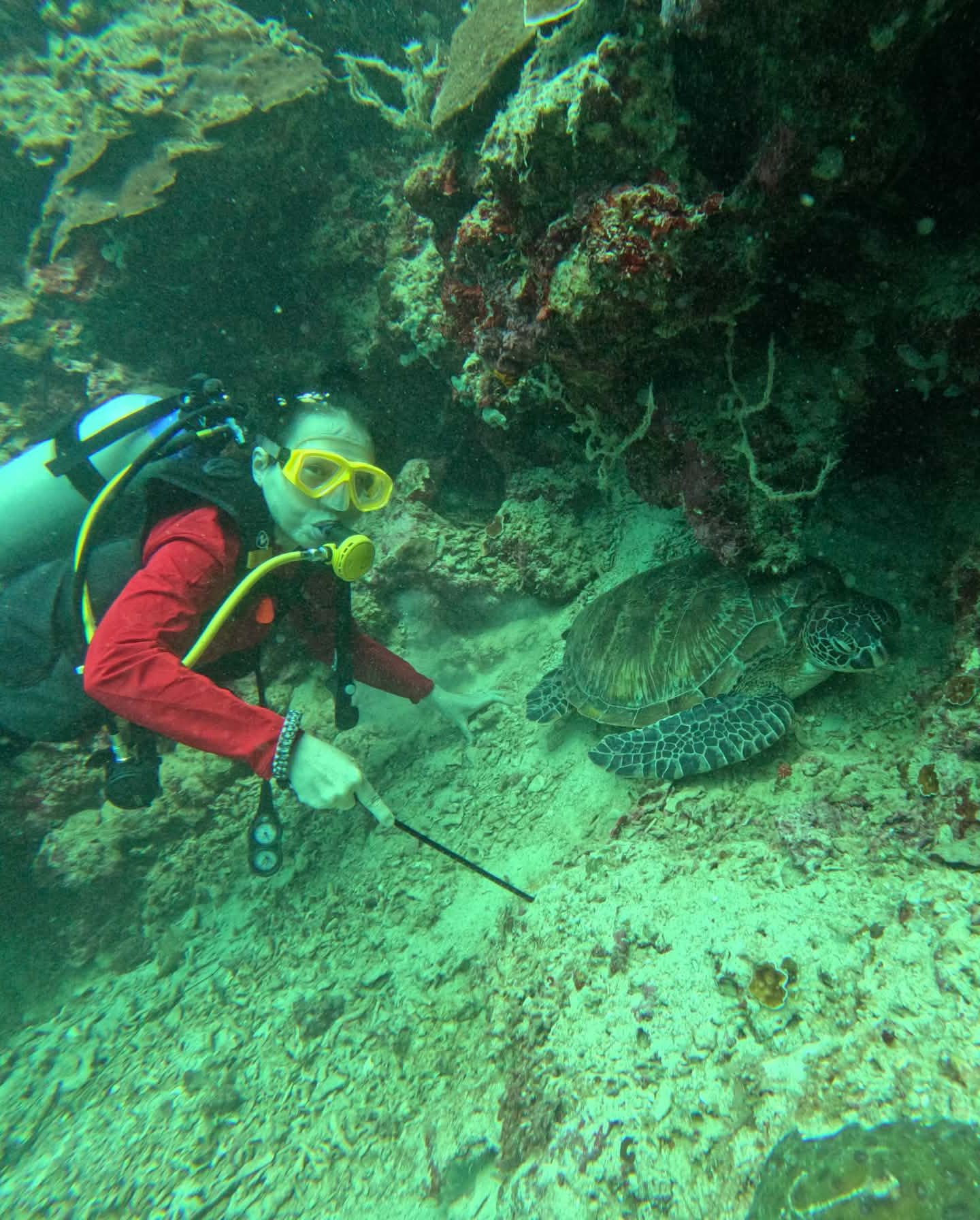 Rùa biển xuất hiện rất nhiều. Chúng hiền lành, nằm im hoặc bơi chậm rãi ngay cạnh thợ lặn, chẳng buồn quan tâm con người. Tôi chỉ vừa giơ tay chạm nhẹ vào mai rùa thì bị bạn guide nhắc ngay: không chạm vào sinh vật biển. Quy tắc bảo tồn được tuân thủ rất nghiêm.