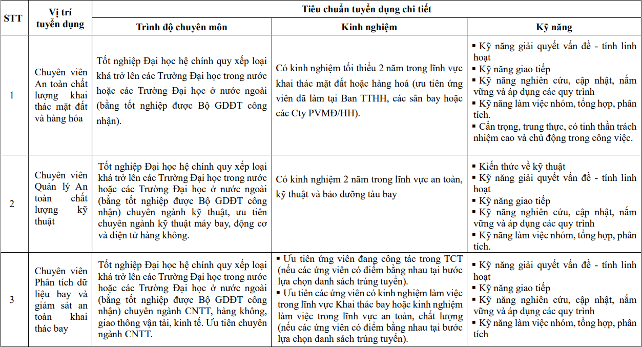 Ứng viên là công dân Việt Nam cư trú trong nước, có sức khỏe phù hợp với yêu cầu công việc, lý lịch rõ ràng và không có tiền án tiền sự. Độ tuổi tối đa là 30 (tính theo năm sinh từ ngày 01/01/1995 trở lại đây). Đối với vị trí Chuyên viên An toàn chất lượng khai thác mặt đất và hàng hóa và Chuyên viên Quản lý an toàn chất lượng kỹ thuật, ứng viên thuộc các CQ, ĐV trong TCTHK không quá 40 tuổi (tính theo năm sinh từ ngày 01/01/1985). Những trường hợp bị mất hoặc hạn chế năng lực hành vi dân sự, đang bị truy cứu trách nhiệm hình sự hoặc đang trong diện áp dụng các biện pháp xử lý hành chính sẽ không đủ điều kiện đăng ký.
