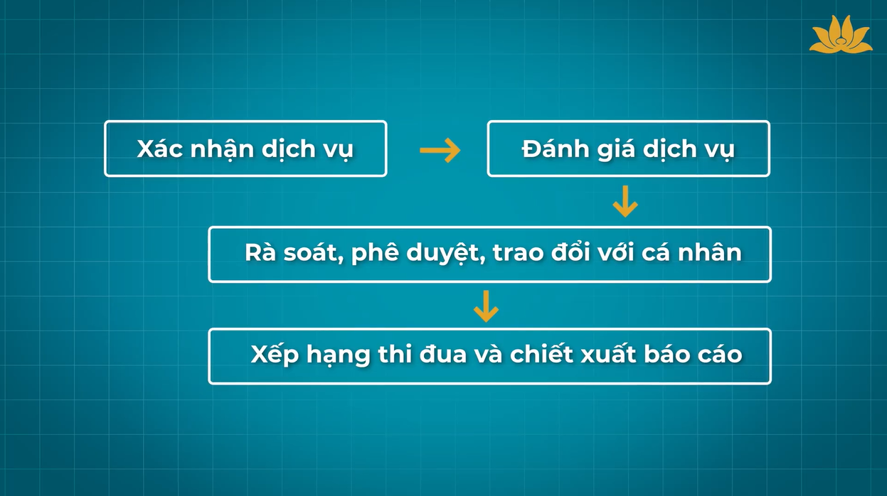 Toàn bộ quy trình đánh giá được vận hành minh bạch và thống nhất qua nhiều giai đoạn. Khi dịch vụ đánh giá phát sinh, chuyên viên/nhân viên sẽ xác nhận và thực hiện đánh giá trong vòng 3 ngày. Dữ liệu đánh giá được tổng hợp từ ngày 26 đến ngày 30 hàng tháng và tiếp tục được hậu kiểm từ ngày mùng 1 đến ngày mùng 4 tháng sau do cấp phòng và cấp Ban thực hiện. Xếp hạng của người lao động được cập nhật theo thời gian thực, trước khi các đơn vị gửi báo cáo về Ban Tổ chức Nhân lực vào ngày mùng 5 hàng tháng.