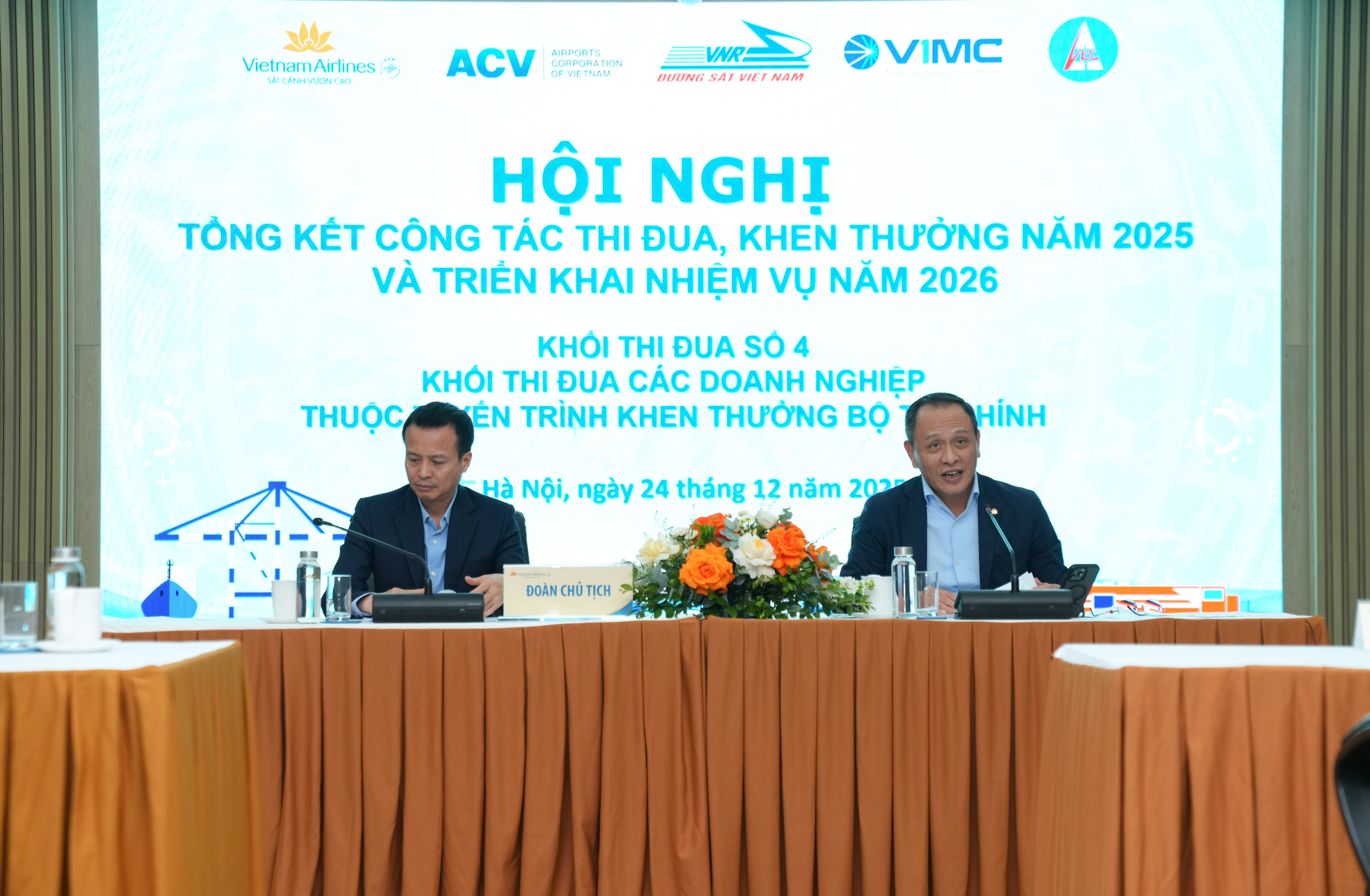 Khối thi đua số 4 quy tụ 05 doanh nghiệp thuộc tuyến khen thưởng của Bộ Tài chính, được thành lập theo Quyết định số 3829 ngày 28/10/2025, bao gồm: Tổng công ty Hàng không Việt Nam (Vietnam Airlines), Tổng công ty Cảng hàng không Việt Nam (ACV), Tổng công ty Đường sắt Việt Nam (VNR), Tổng công ty Hàng hải Việt Nam (Vinalines) và Tổng công ty Đầu tư phát triển đường cao tốc Việt Nam (VEC).