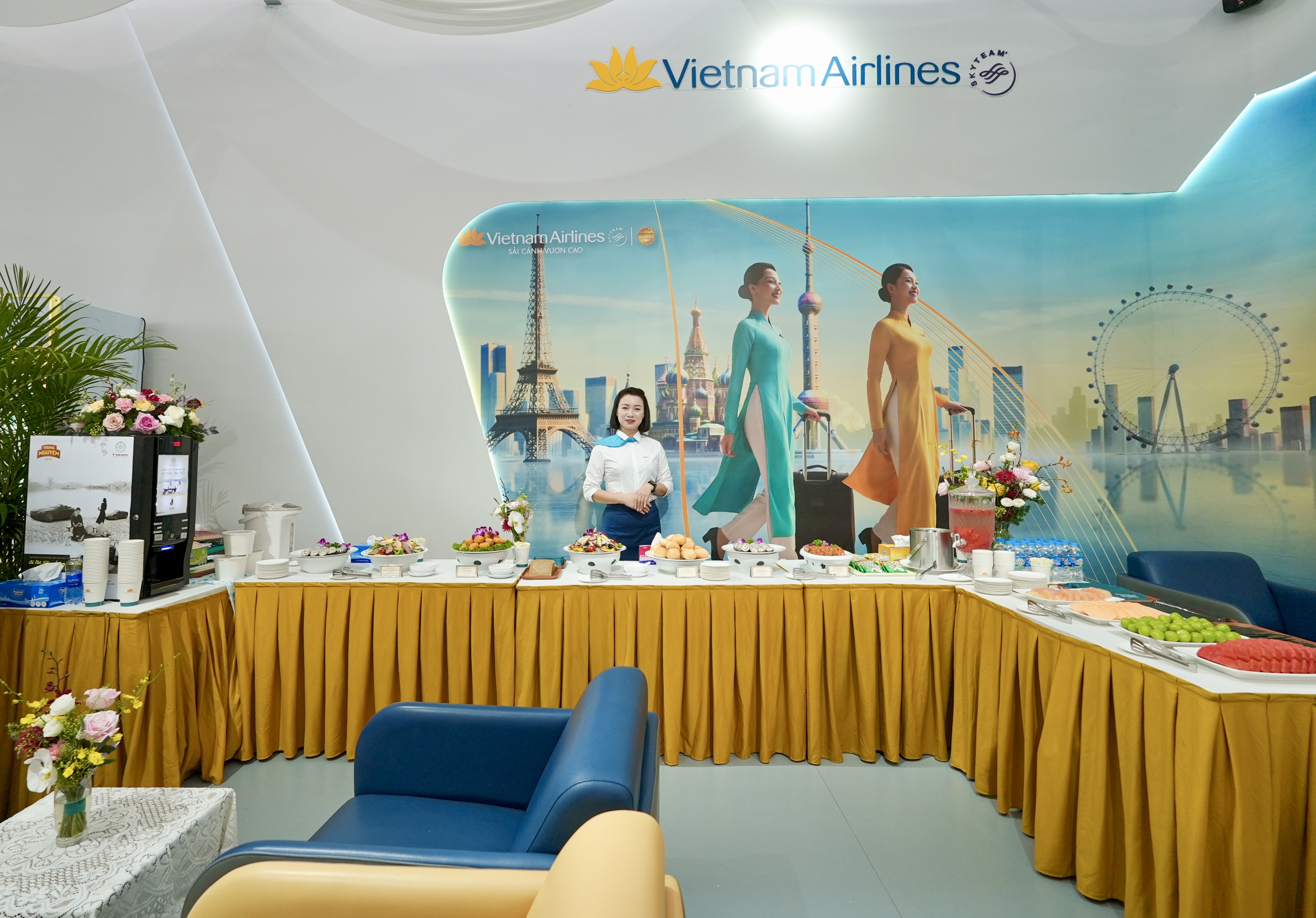 Trong gian trưng bày “Khát vọng bầu trời” của Vietnam Airlines, Phòng khách Bông Sen được tái hiện tinh tế, sang trọng với không gian nghỉ ngơi tiện nghi và quầy buffet đa dạng. Khách tham quan có thể thư giãn, thưởng thức cà phê, trà, nước trái cây hay cocktail với sự phục vụ chu đáo của đội ngũ nhân viên Vietnam Airlines.