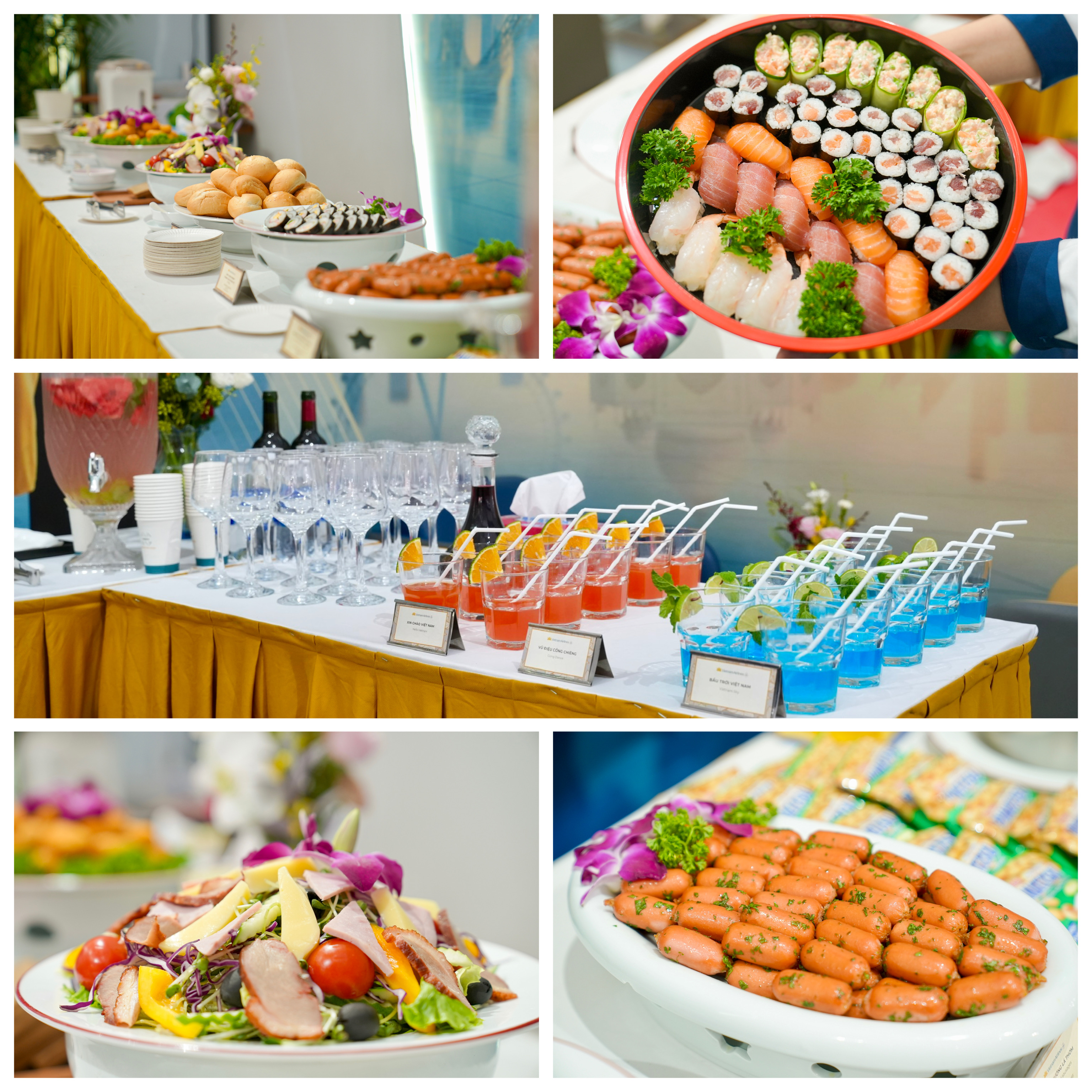 Điểm nhấn của trải nghiệm chính là ẩm thực phong phú, được bày trí đẹp mắt trên quầy tiệc. Các món ăn hấp dẫn như sushi, sashimi, salad rau củ và thịt nguội, xúc xích nướng lá thơm, bánh mì tươi, kimbap cùng nhiều loại trái cây, bánh ngọt… mang lại cho khách tham quan cảm giác như đang ở trong phòng chờ Thương gia tại sân bay quốc tế. Bên cạnh đó là đồ uống mát lạnh, trà trái cây, nước khoáng, đáp ứng nhu cầu của cả gia đình, từ người lớn đến trẻ nhỏ.