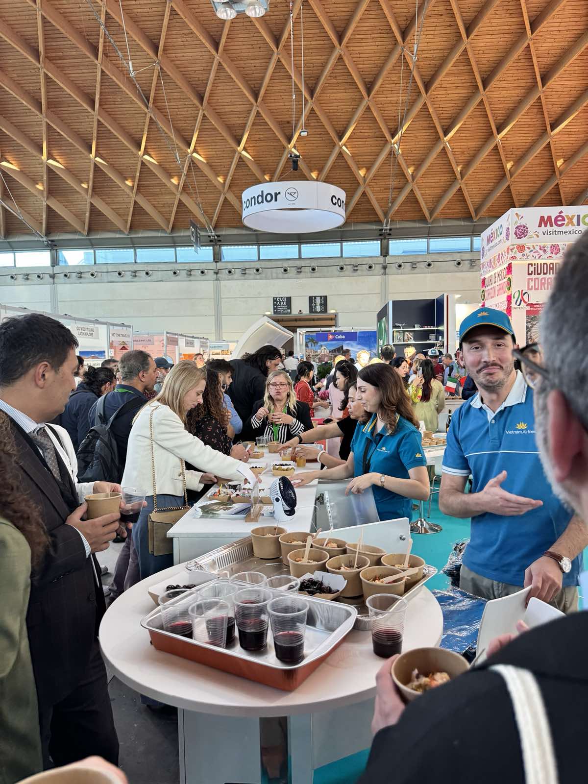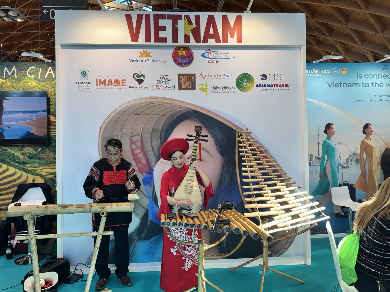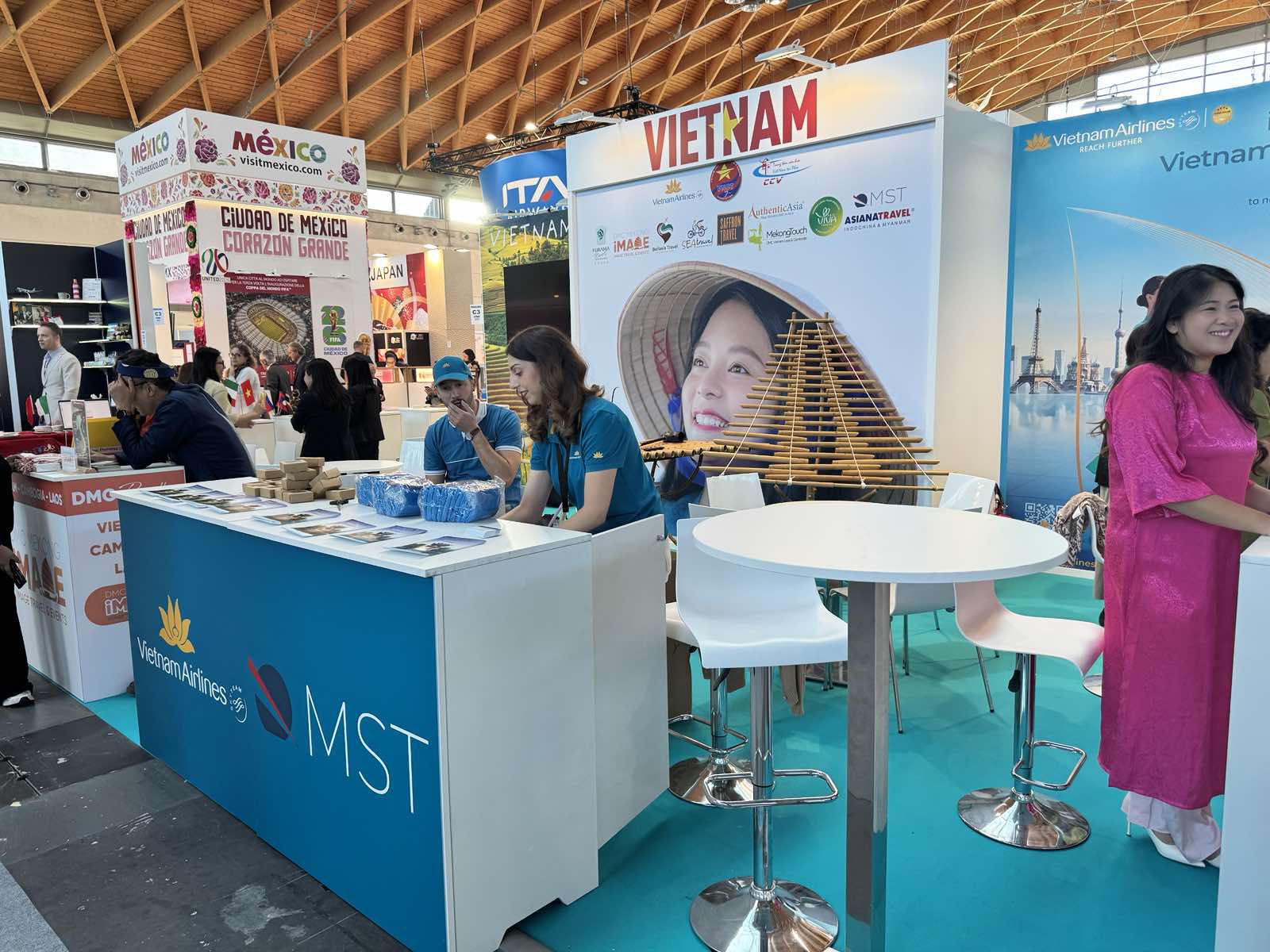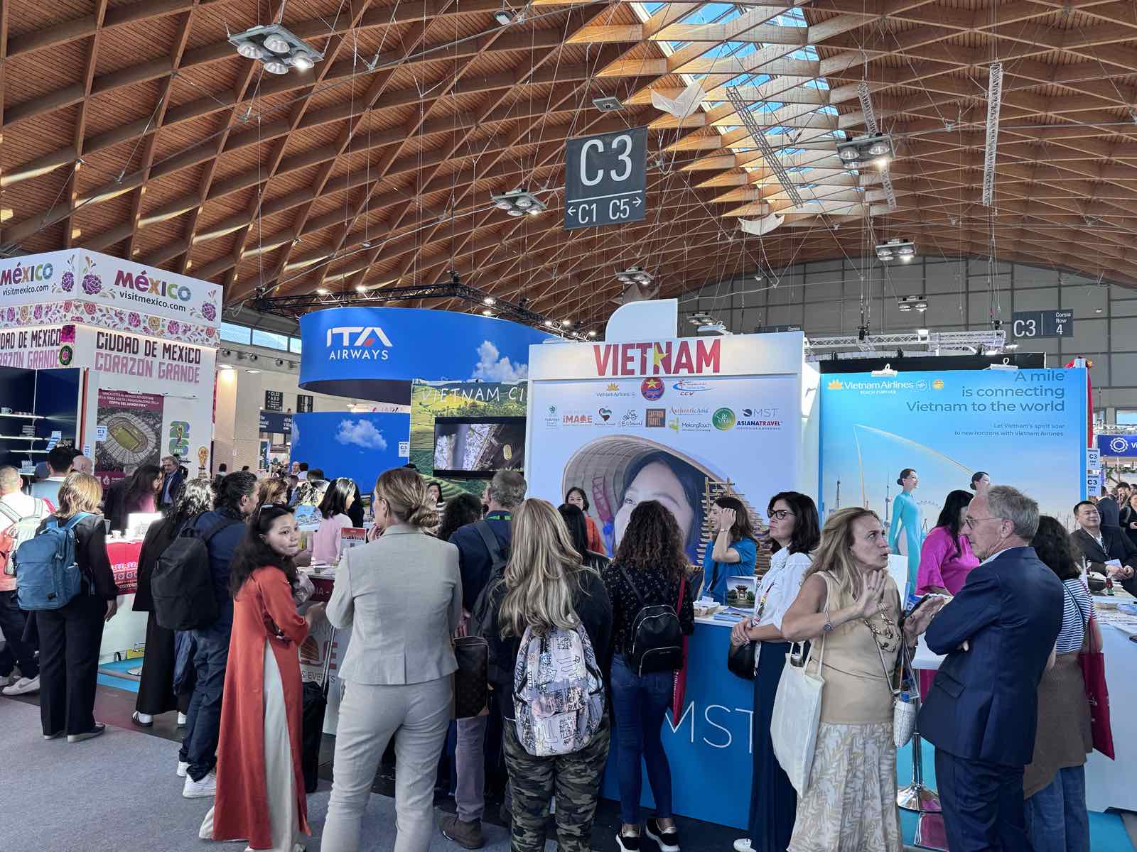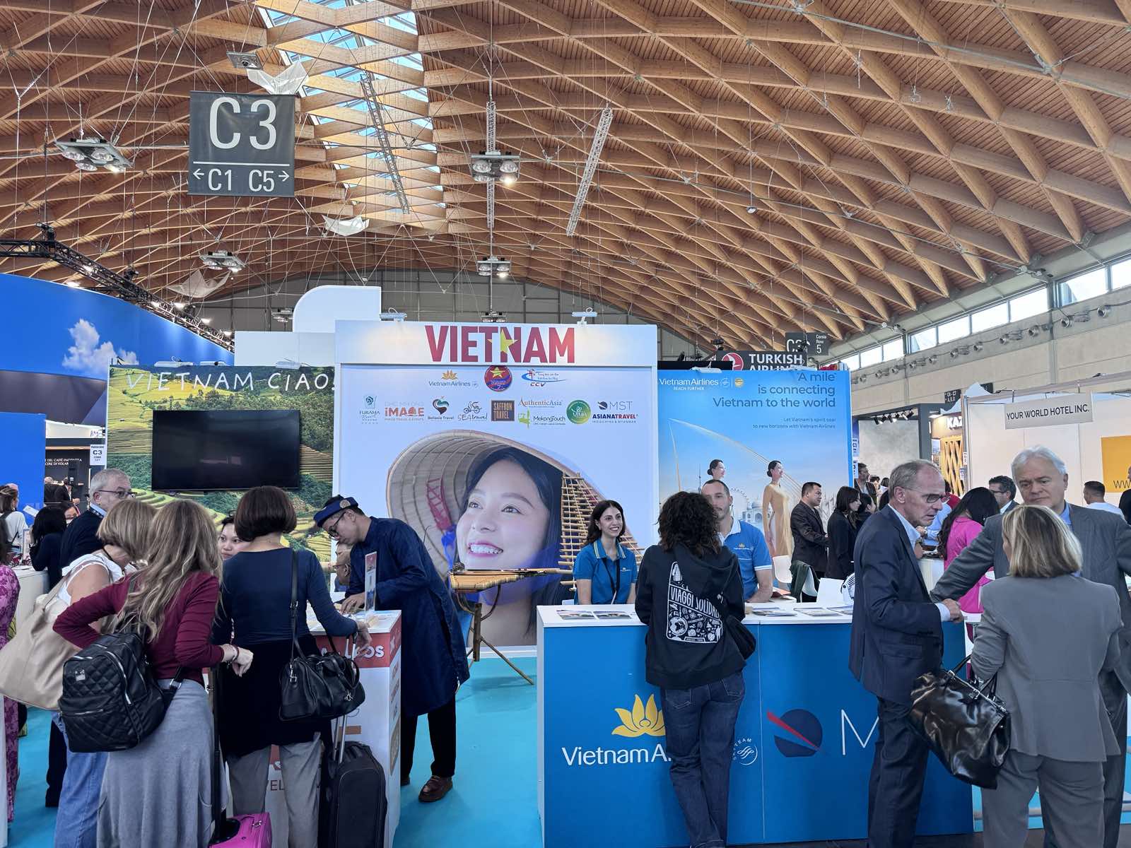 Năm nay, không gian triển lãm được chia thành ba khu vực chính: Italy (tôn vinh du lịch quốc gia chủ nhà), The World (giới thiệu các điểm đến quốc tế) và Global Village (nơi hội tụ các nhà cung cấp dịch vụ du lịch toàn cầu). Giữa không gian sôi động đó, Vietnam Airlines hiện diện nổi bật với gian hàng chung của Việt Nam, được phối hợp xây dựng cùng Hiệp hội Xúc tiến Văn hóa và Du lịch Việt Nam tại Pháp và châu Âu (APCTV) cùng nhiều doanh nghiệp du lịch trong nước. Với diện tích khoảng 48m², gian hàng được thiết kế như một không gian văn hóa Việt thu nhỏ, nơi du khách và đối tác quốc tế có thể cảm nhận tinh thần hiếu khách, sự đa dạng và chiều sâu văn hóa của dải đất hình chữ S.
