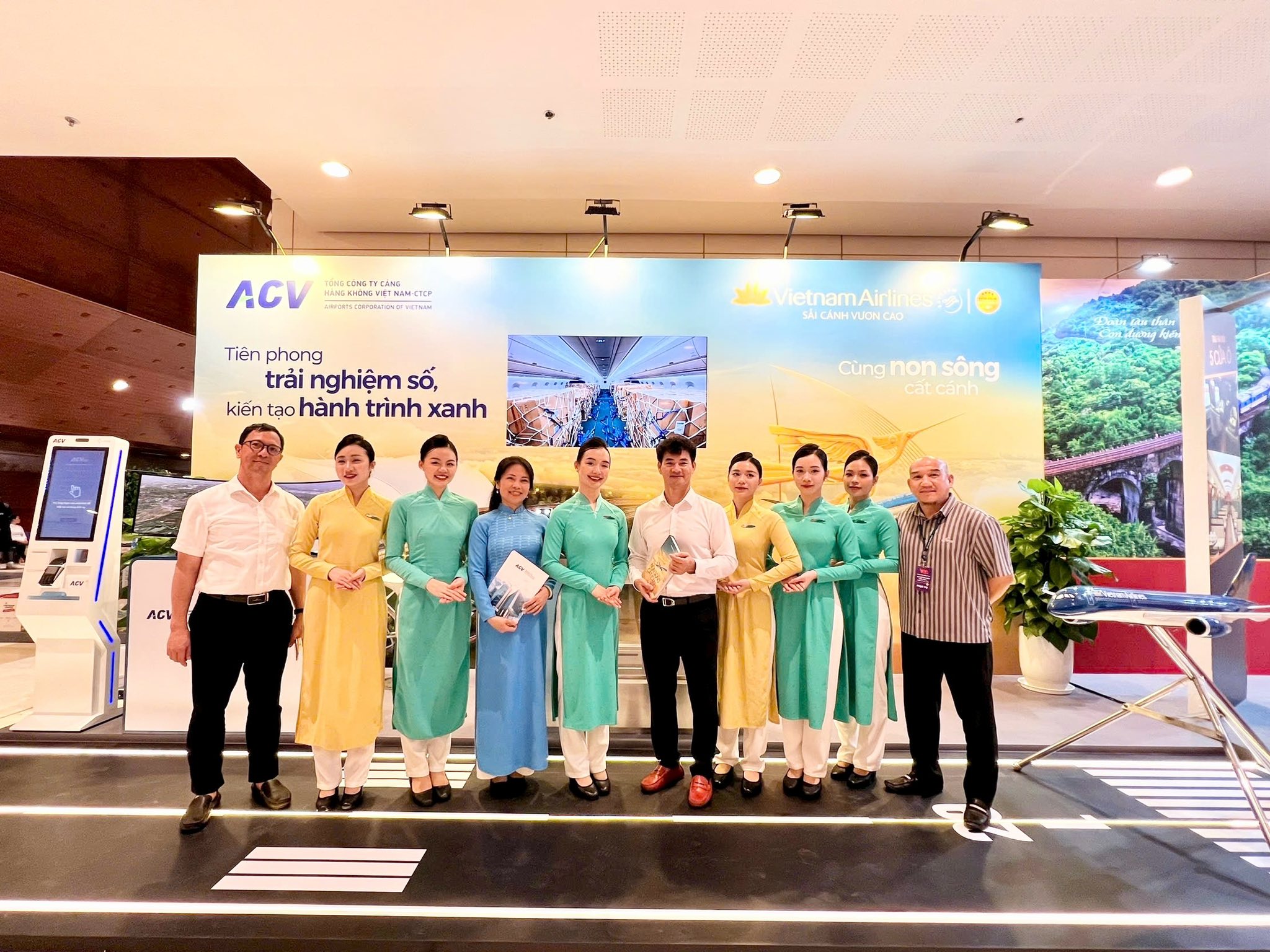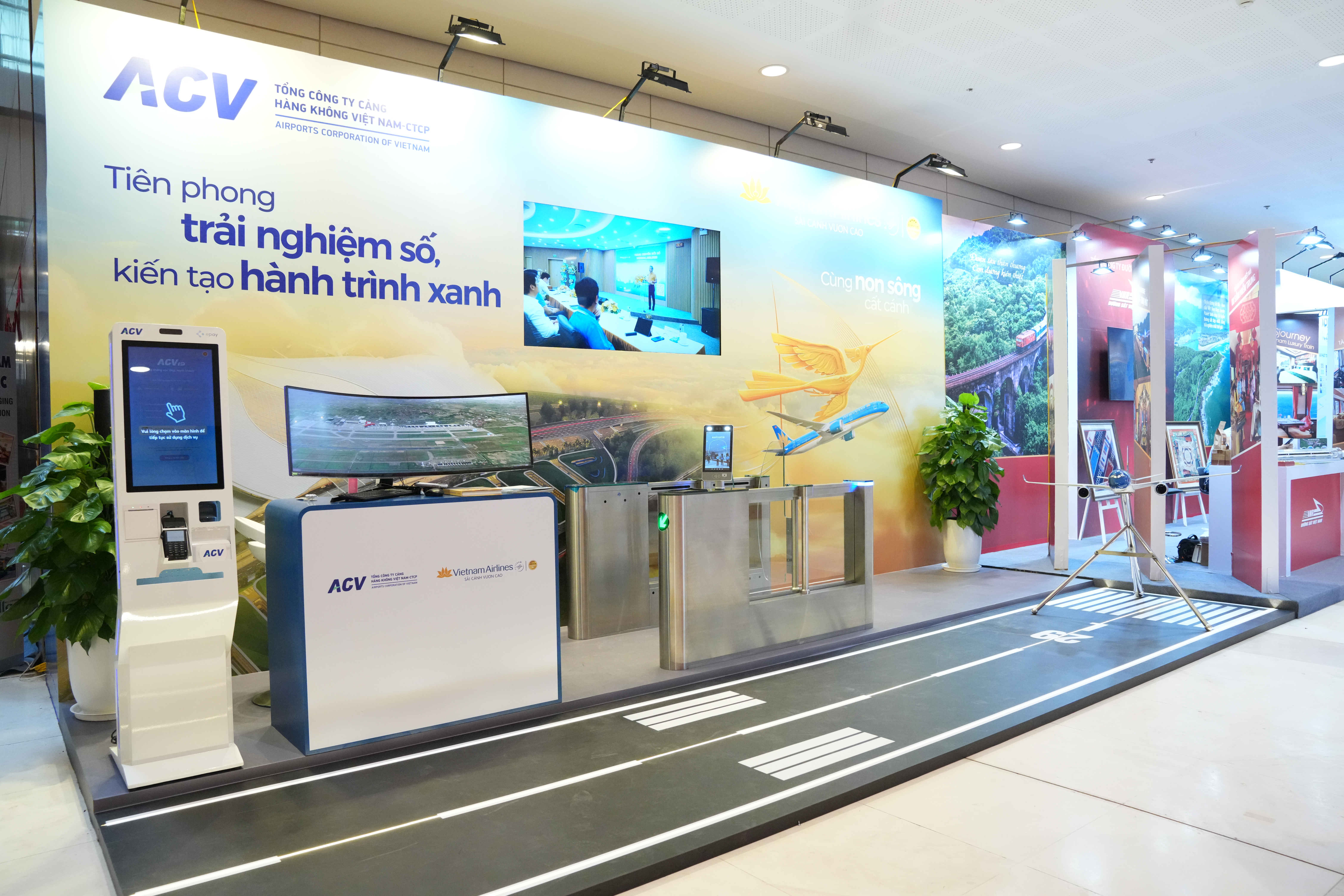 Với chủ đề “Tiên phong chuyển đổi số – Kiến tạo hành trình xanh”, gian hàng thể hiện rõ tầm nhìn của Vietnam Airlines và ACV trong hành trình hướng tới một ngành hàng không thông minh, xanh và thân thiện với môi trường. Không gian trưng bày được thiết kế mô phỏng chu trình thông minh của hành khách trước chuyến bay, giúp khách tham quan có thể trực tiếp trải nghiệm hành trình số hóa toàn diện, từ hệ thống nhận diện sinh trắc học toàn trình, quầy thủ tục tự động, đến các giải pháp công nghệ hiện đại tại sân bay và trên chuyến bay.
