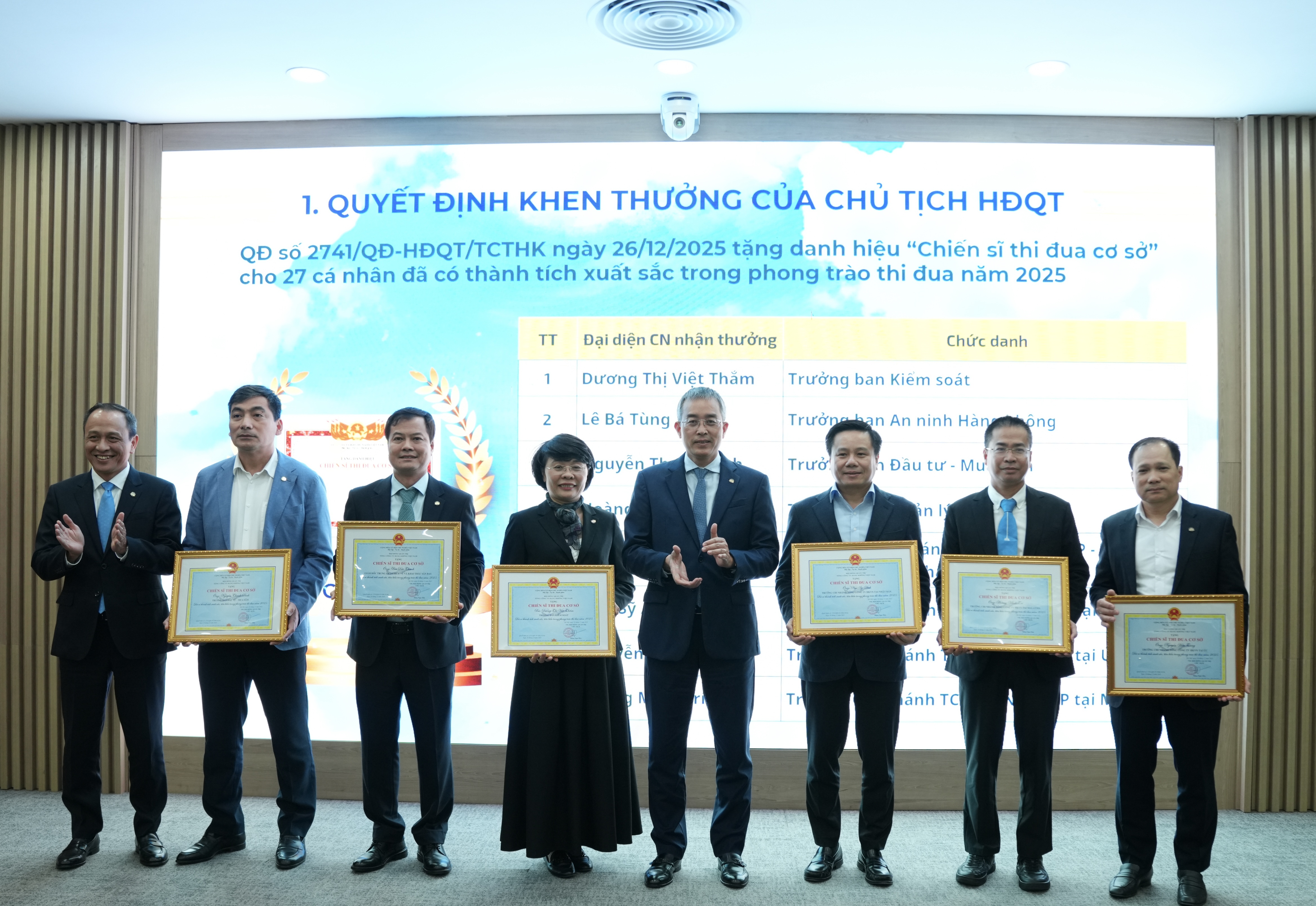 Về hoạt động sản xuất kinh doanh: Chủ tịch HĐQT tặng Giấy khen cho 61 tập thể đã có thành tích xuất sắc trong phong trào thi đua năm 2025. Ngoài ra, nhiều tập thể, cá nhân khác đã được nhận Cờ, Bằng khen của Bộ Tài chính, Tổng Liên đoàn Lao động Việt Nam vì có thành tích trong các lĩnh vực công tác, phong trào thi đua và hoạt động Công đoàn năm 2026