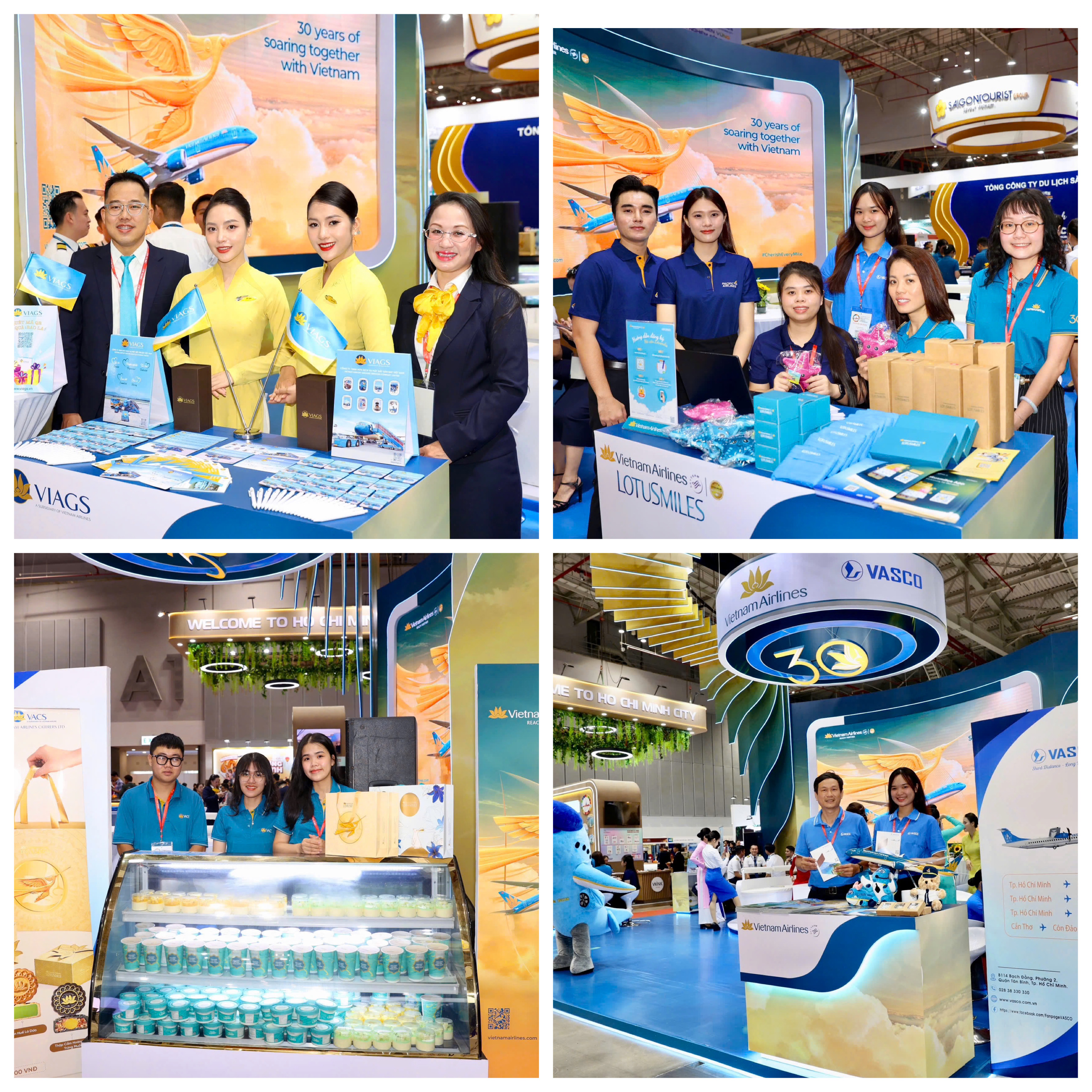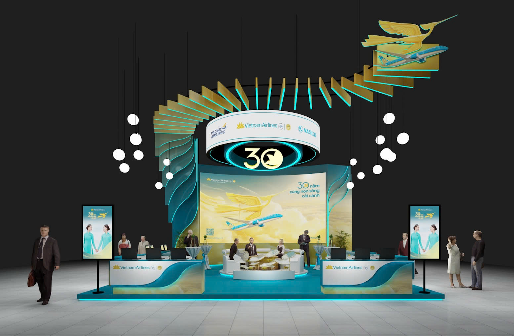 Năm nay, gian hàng Vietnam Airlines được thiết kế đặc biệt với chủ đề “30 năm – Cùng non sông cất cánh”. Không gian trưng bày tái hiện hành trình ba thập kỷ phát triển của hãng hàng không quốc gia, đồng thời giới thiệu định hướng phát triển bền vững trong tương lai.
