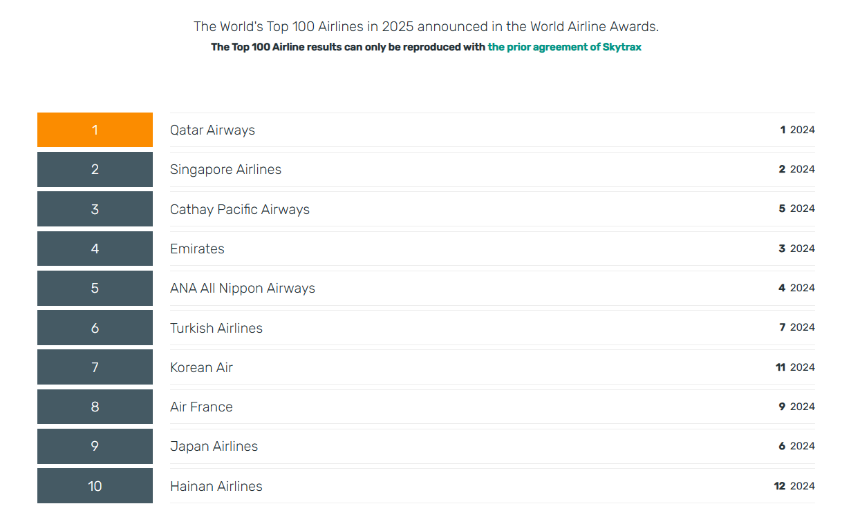 Ngày 17/6, tại triển lãm Hàng không Paris 2025, giải thưởng Skytrax World Airline Awards đã chính thức công bố danh sách các hãng hàng không xuất sắc nhất năm. Các kết quả của Skytrax được xác định dựa trên khảo sát hơn 22 triệu hành khách toàn cầu từ tháng 9/2024 đến tháng 5/2025, phản ánh mức độ hài lòng và chất lượng dịch vụ của hơn 325 hãng hàng không trên toàn thế giới.
