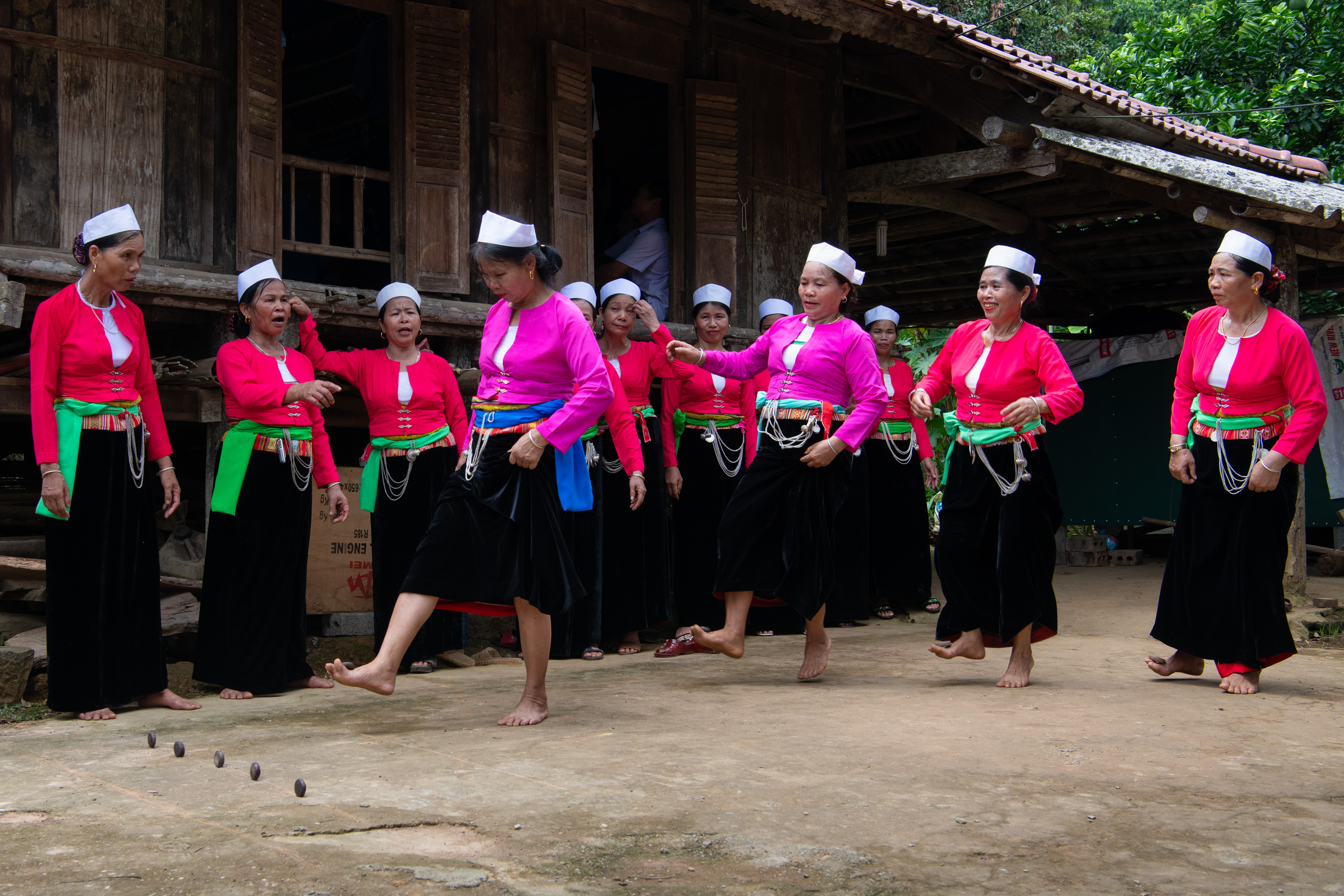 Thường thường, các phường Sắc bùa được tổ chức theo đoàn, “rồng rắn lên mây” ngoằn nghèo đi qua những con suối, bờ ruộng để đến từng ngôi nhà sàn trong bản. Dẫn đầu là trưởng phường cất tiếng hát theo các công đoạn như: hát đi đường, hát vào cổng, hát dưới chân cầu thang, hát xin lên nhà, hát cảm ơn. Mỗi gia đình đều vui mừng tiếp đón phường Sắc bùa. Chủ nhà bày rượu cần, những chiếc bánh đặc sản của người Mường như bánh “Pêng Pang” (bánh chưng) và cỗ bàn tiếp đón. Trong tiếng cồng, chiêng, tiếng hát chất phác miêu tả đời sống và tình yêu xóm làng như trong một lễ Sắc bùa ở Hòa Bình: “Anh em phường bùa chúng tôi/Chúc Tết nhà ông/Trông đi ngó lại/Trâu bò nhà ông/Nhốt buộc đầy sân/Đụm lúa nếp nhà ông/Ăn đến hết tháng 5/Đụm lúa chăm nhà ông/Ăn đến hết tháng 10/Dàn chiêng xéc bùa chúng tôi/Leo qua 9 vai núi/Lội qua 10 áng mây…”