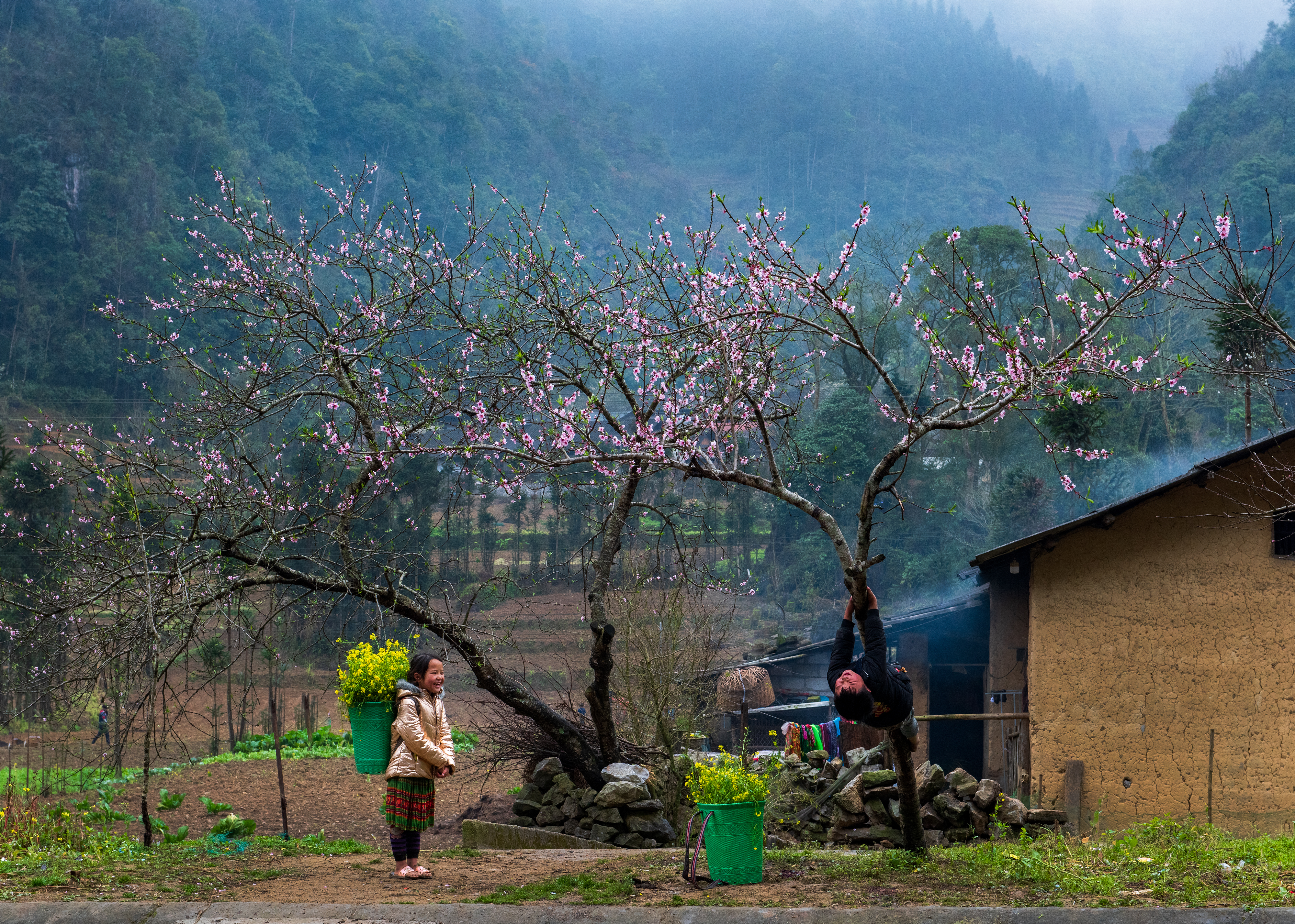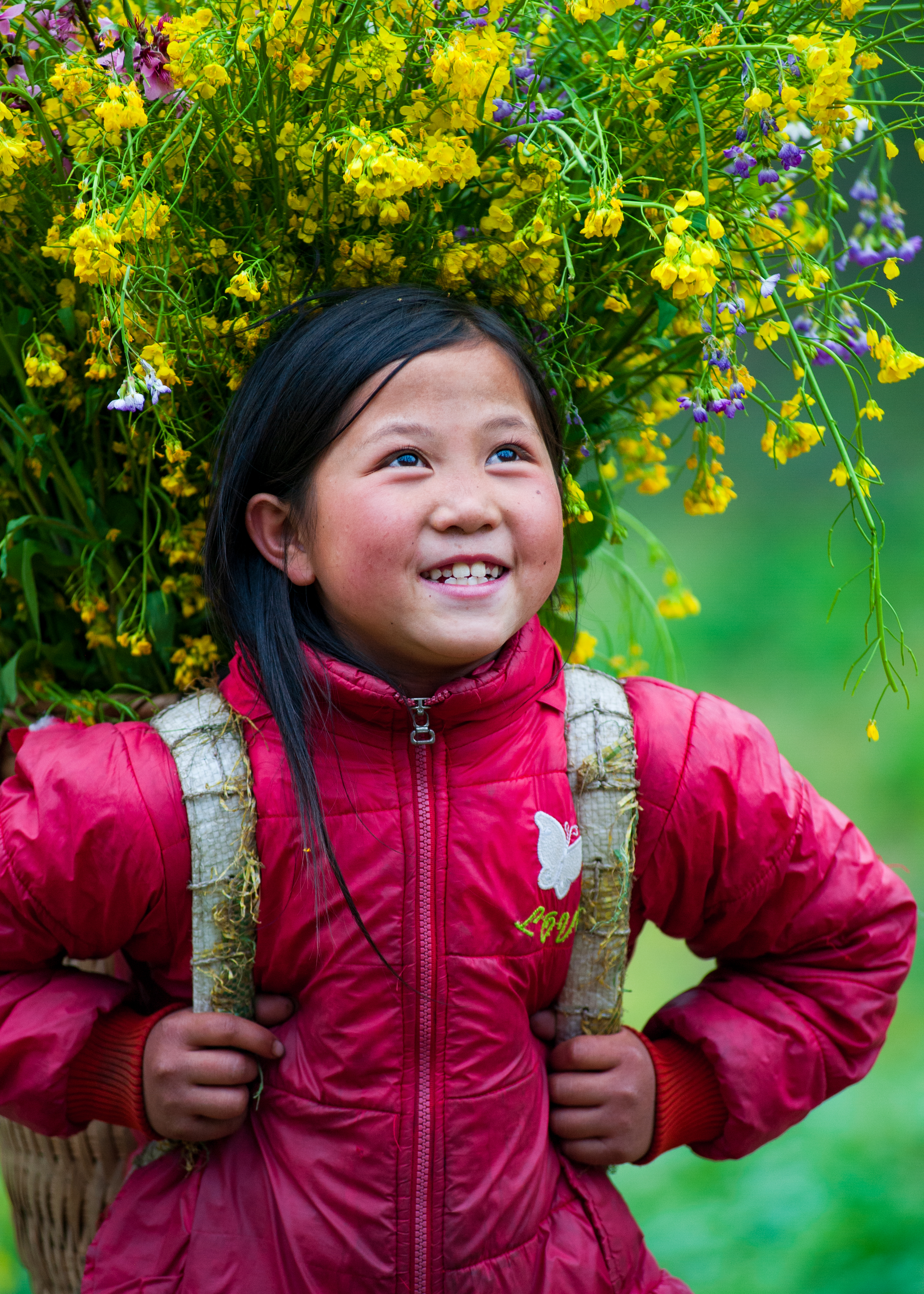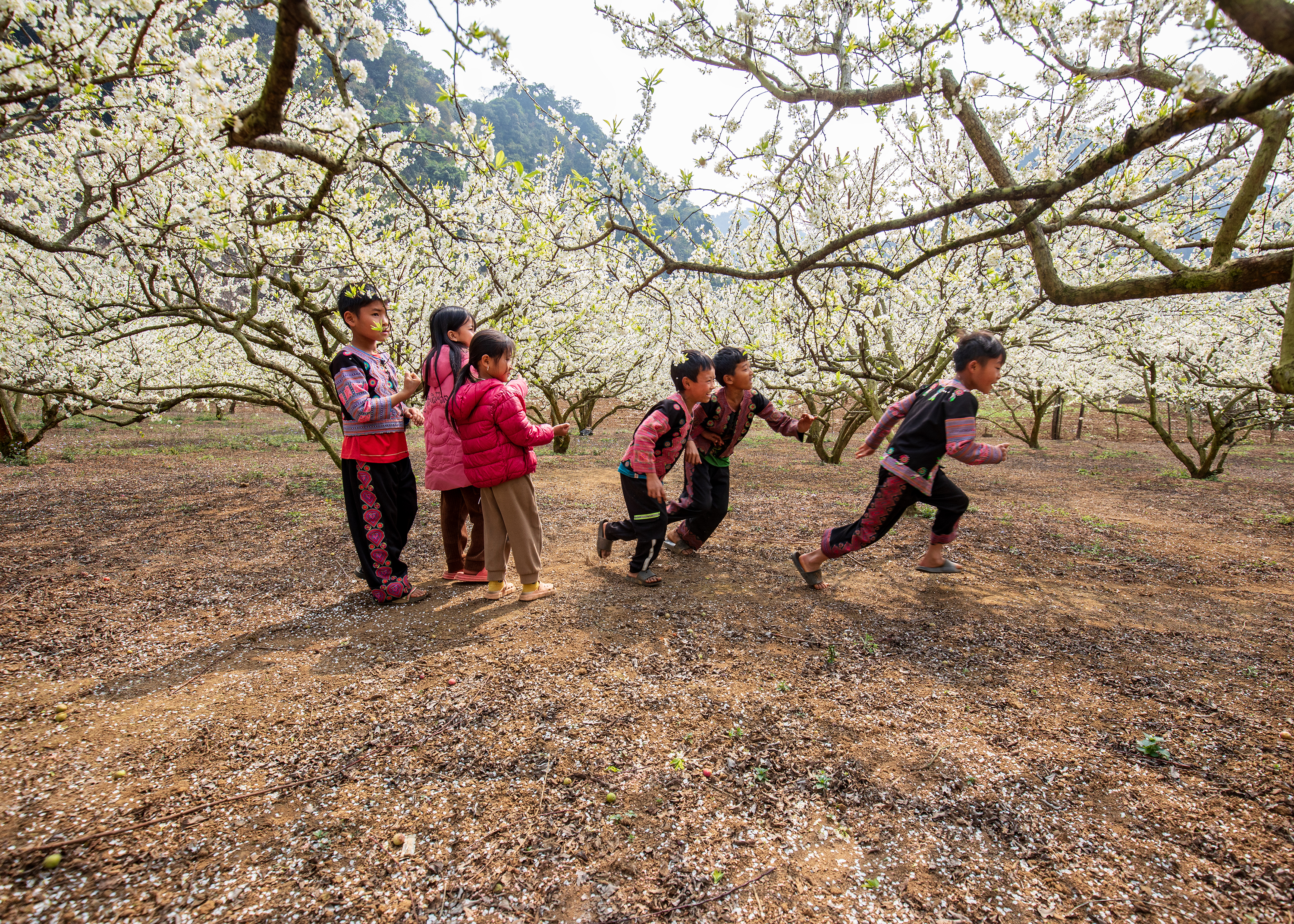 Những bông hoa ấy được tô điểm bởi sắc hồng trên đôi má, còn đôi mắt trong sáng phản chiếu sự bình yên của bản làng. Các em thường đi thành từng nhóm nhỏ, 4 hay 5 đứa trẻ ríu rít bên nhau, khi thì đeo gùi hoa sau lưng, lúc lại cầm trên tay những bó hoa nhỏ xinh tự kết. Ở những bản làng làm du lịch cộng đồng, các em còn thổi sáo, hát múa cùng du khách. Sự hồn nhiên, cởi mở và thân thiện ấy khiến bất cứ ai ghé thăm cũng có cảm giác như được trở về miền ký ức tuổi thơ. Có khi, trên một con dốc thoai thoải, vài cậu bé nghịch ngợm đang say sưa chơi những chiếc xe “tự chế” bằng tre, bằng gỗ. Chỉ mấy đứa trẻ nô đùa thôi mà đủ làm xốn xang cả núi đồi.