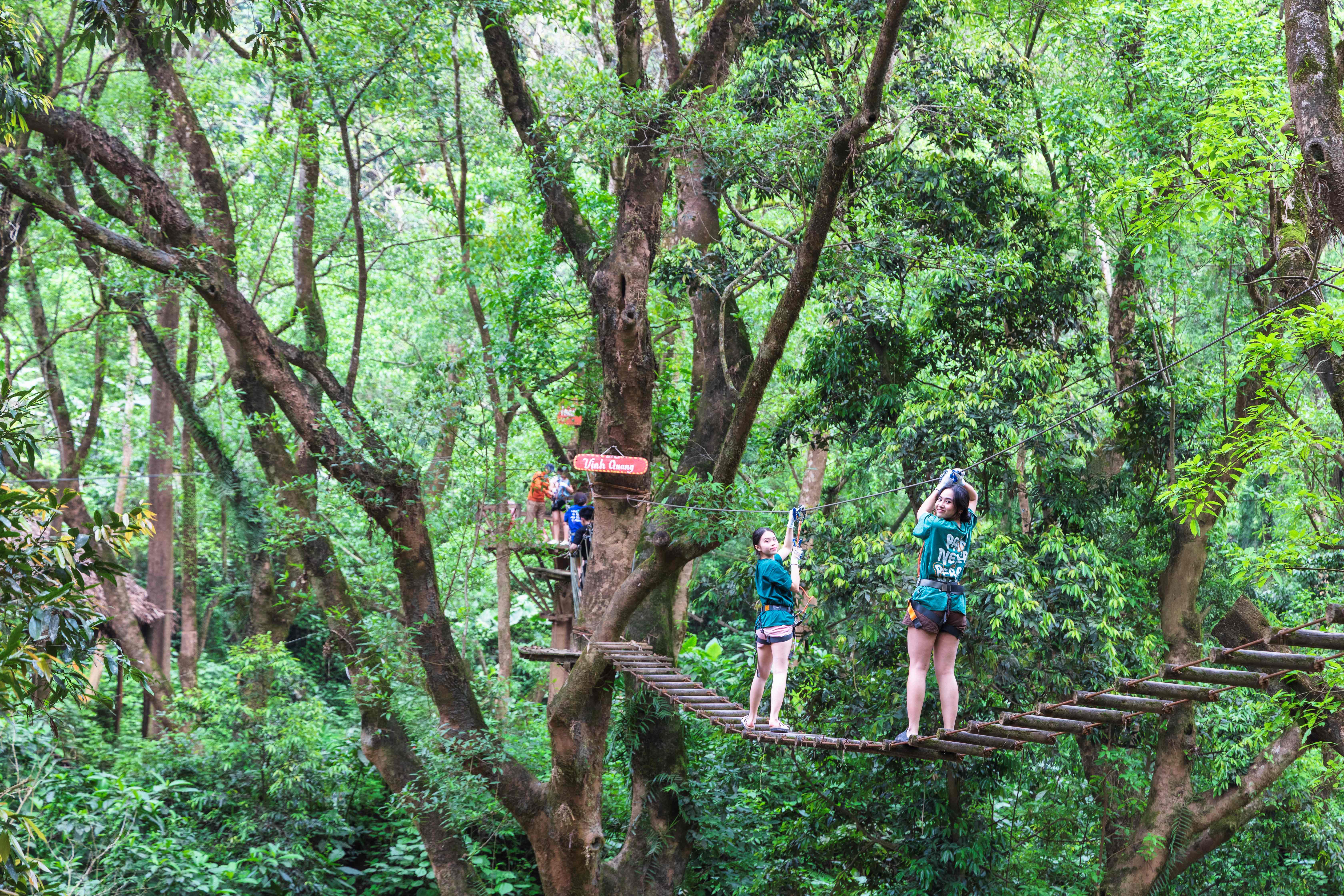 Với những tín đồ của du lịch trải nghiệm và ưa thích thử thách, công viên mang đến nhiều hoạt động như đi bộ xuyên rừng, chèo thuyền kayak trên dòng suối xanh mát hay thử làm Tarzan leo cây. Hệ thống cầu treo dài hơn 1km cho phép du khách đi xuyên rừng mà không xâm hại đến hệ sinh thái bên dưới. Không có những công trình đồ sộ hay dịch vụ xa hoa, nơi đây ghi dấu trong lòng du khách bằng một không gian bình yên với cỏ cây, đá, suối hoang sơ.