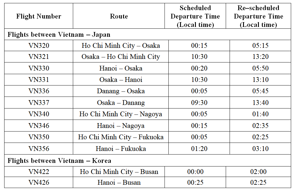 Affected flights will be delayed from 35 minutes to 2 hours, including flights between Ho Chi Minh City/Hanoi/Danang and Osaka (VN320, VN330, VN336/337), flights from Ho Chi Minh City/Hanoi to Nagoya (VN340, VN346), flights from Ho Chi Minh City/Hanoi to Busan (VN422, VN 426).