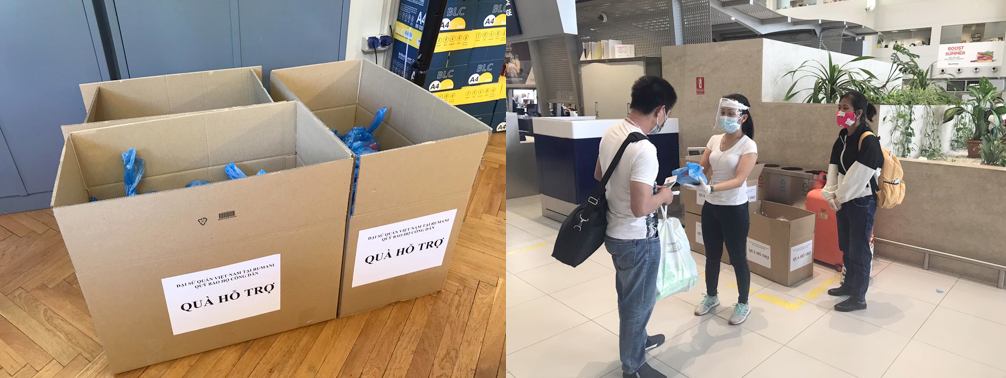 Nhân viên Đại sứ quán Việt Nam tại Rumani tặng quà hỗ trợ công dân. (Ảnh: CNEU).