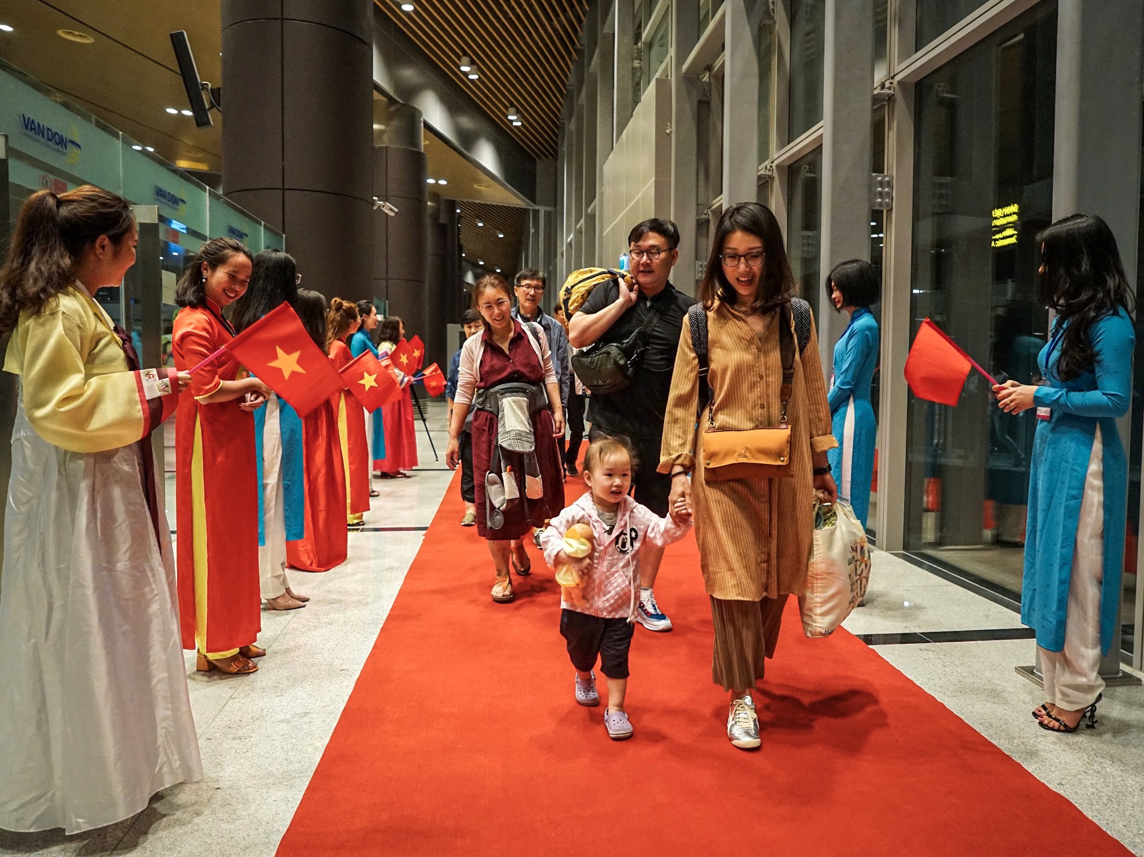Các hành khách trên Chuyến bay quốc tế đầu tiên của hàng không Việt Nam đến Vân Đồn.
