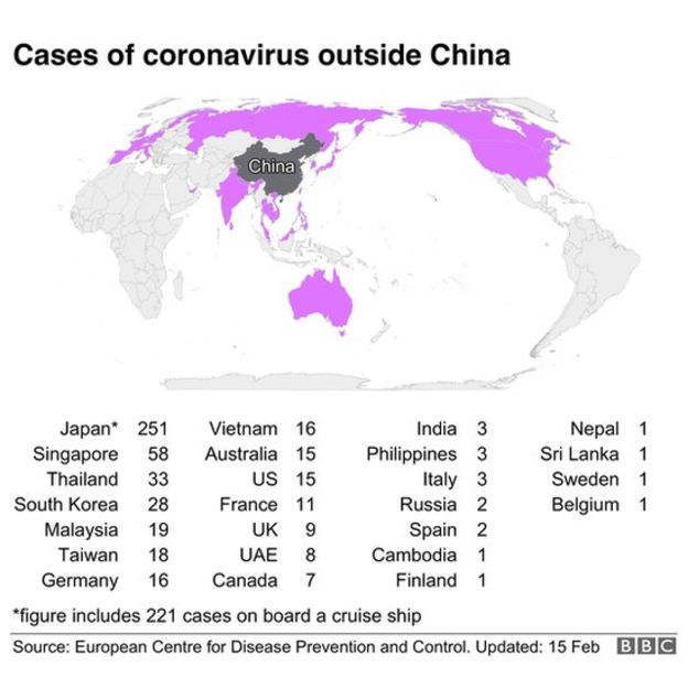 Phân bố số trường hợp nhiễm virus Covid-19 ở ngoài Trung Quốc (tính đến ngày 15/2/2020) (Ảnh: Trung tâm Kiểm soát và Phòng bệnh châu Âu/BBC).