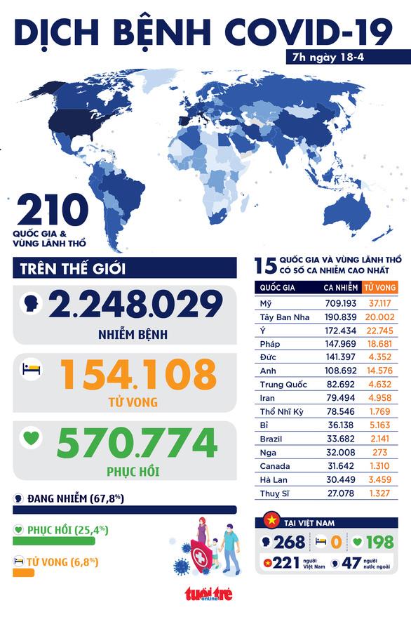 Tính đến sáng 18/4, tổng cộng có 69.045 người tiếp xúc gần và nhập cảnh từ vùng dịch đang được theo dõi sức khỏe (cách ly), trong đó 324 người cách ly tập trung tại bệnh viện, 11.549 người cách ly tập trung tại cơ sở khác; 57.172 người cách ly tại nhà, nơi lưu trú.