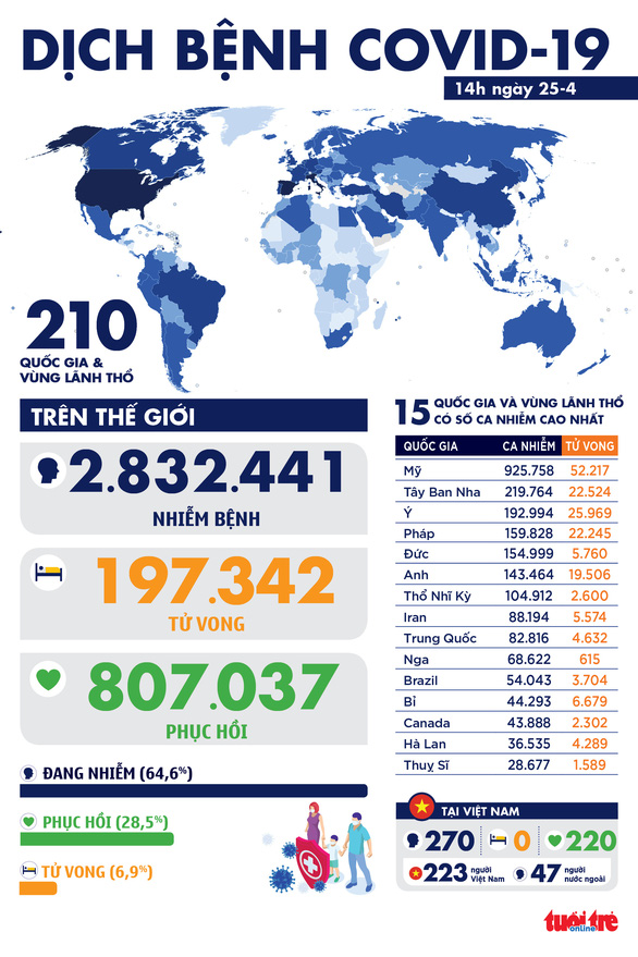 Tới 2h sáng nay 25/4, theo hãng tin AFP, tổng số người bệnh COVID-19 chết ở Mỹ đã vượt 50.000 (chính xác là 50.360), cao nhất thế giới.