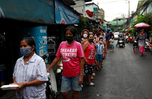 Người dân xếp hàng nhận thực phẩm được phát miễn phí ở một khu ổ chuột tại thủ đô Bangkok, Thái Lan ngày 25/4 (Ảnh: REUTERS).