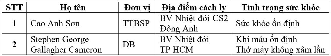 02 Tiếp viên Nguyễn Thùy Dung 66 và Lê Thị Quyên 25 đã được công bố khỏi bệnh, nhưng vẫn tiếp tục theo dõi tại Bệnh viện Nhiệt đới cơ sở 2 Đông Anh.
