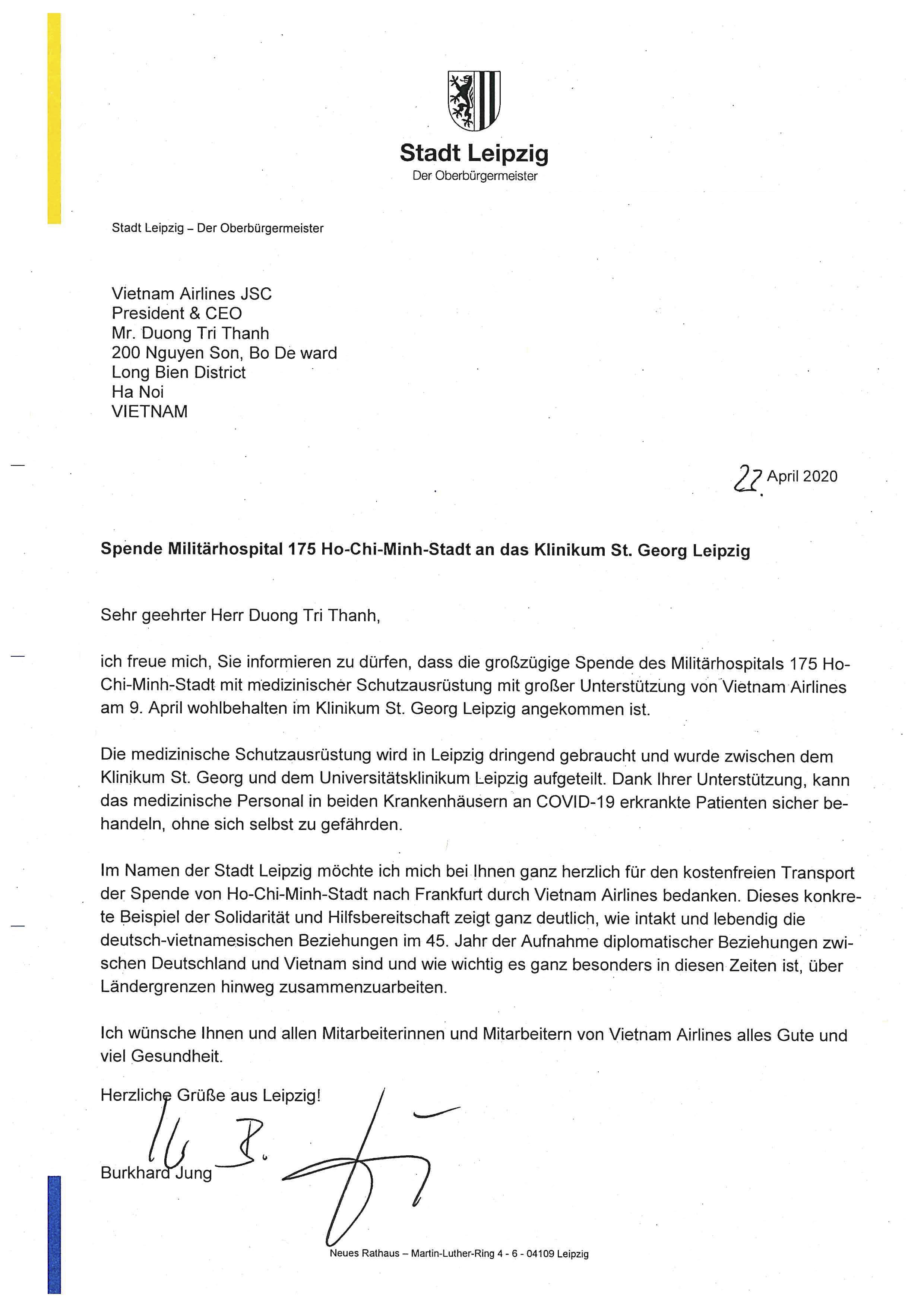 Thư cảm ơn của ông Burkhard Jung – Thị trưởng thành phố Leipzig, CHLB Đức.