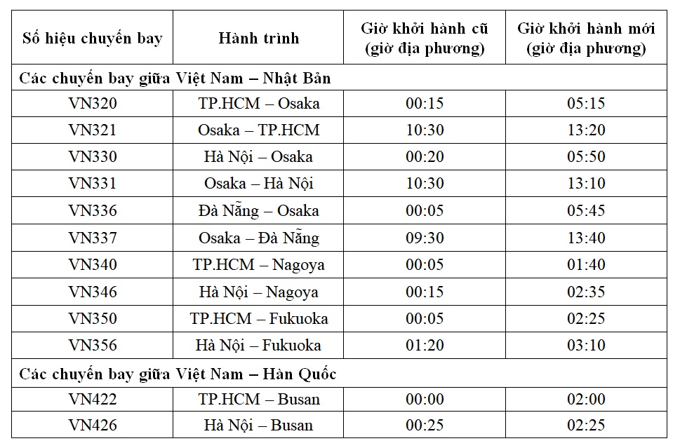 Vietnam Airlines sẽ lùi thời gian cất cánh từ 35 phút đến hơn 2 tiếng đối với các chuyến bay trong ngày 23/9 giữa TP.HCM, Hà Nội, Đà Nẵng và Osaka, gồm VN320, VN330, VN336/337; các chuyến bay từ TP.HCM, Hà Nội đến Nagoya, gồm VN340, VN346; các chuyến bay từ TP. HCM, Hà Nội đến Busan, gồm VN422, VN426.