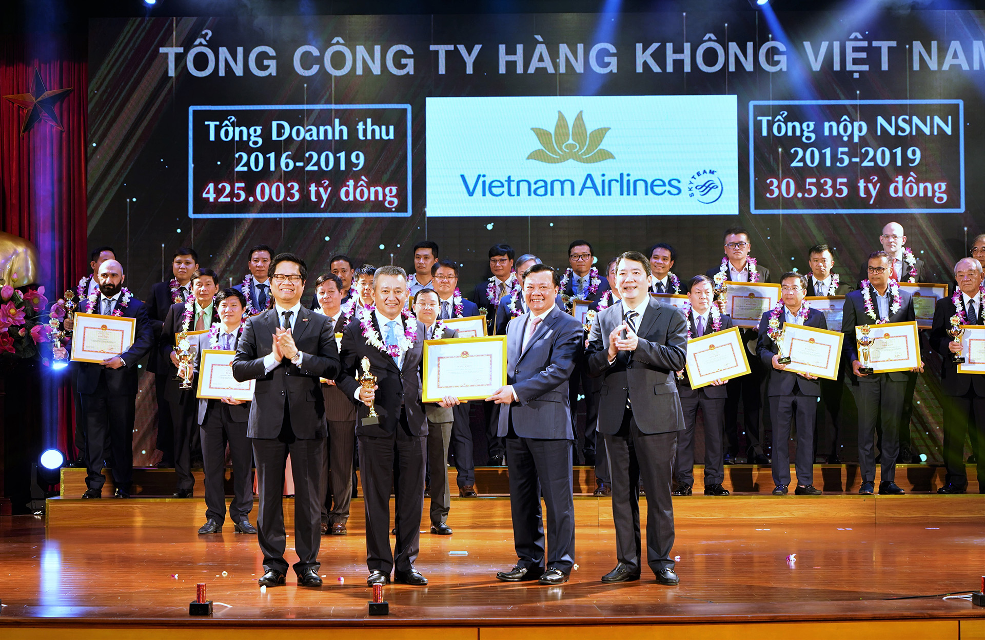 TGĐ Dương Trí Thành đại diện VNA nhận bằng khen và cúp của BTC ghi nhận những đóng góp của Tổng công ty trong việc thực hiện tốt nghĩa vụ nộp thuế vào ngân sách Nhà nước (Ảnh: VNA).