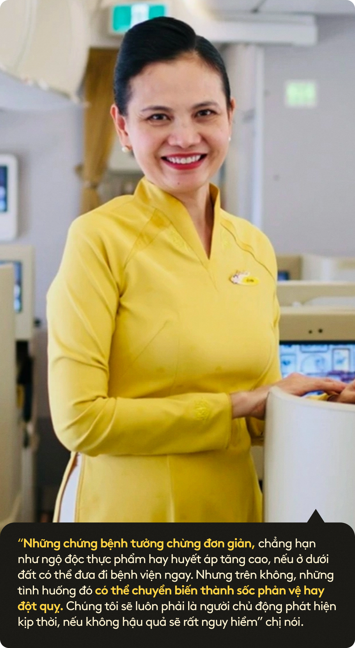 “Những chứng bệnh tưởng chừng đơn giản, chẳng hạn như ngộ độc thực phẩm hay huyết áp tăng cao, nếu ở dưới đất có thể đưa đi bệnh viện ngay. Nhưng trên không, những tình huống đó có thể chuyển biến thành sốc phản vệ hay đột quỵ. Chúng tôi sẽ luôn phải là người chủ động phát hiện kịp thời, nếu không hậu quả sẽ rất nguy hiểm” chị nói.