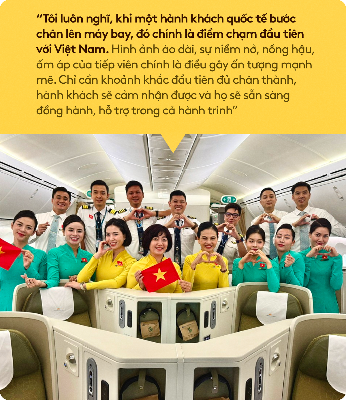 Với chị, chiếc áo dài trên chuyến bay không chỉ là đồng phục, mà còn là hình ảnh của một đại sứ văn hóa – biểu tượng của một đất nước thân thiện và mến khách.