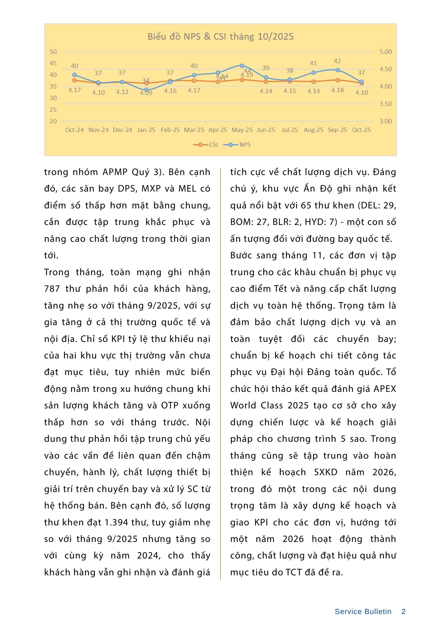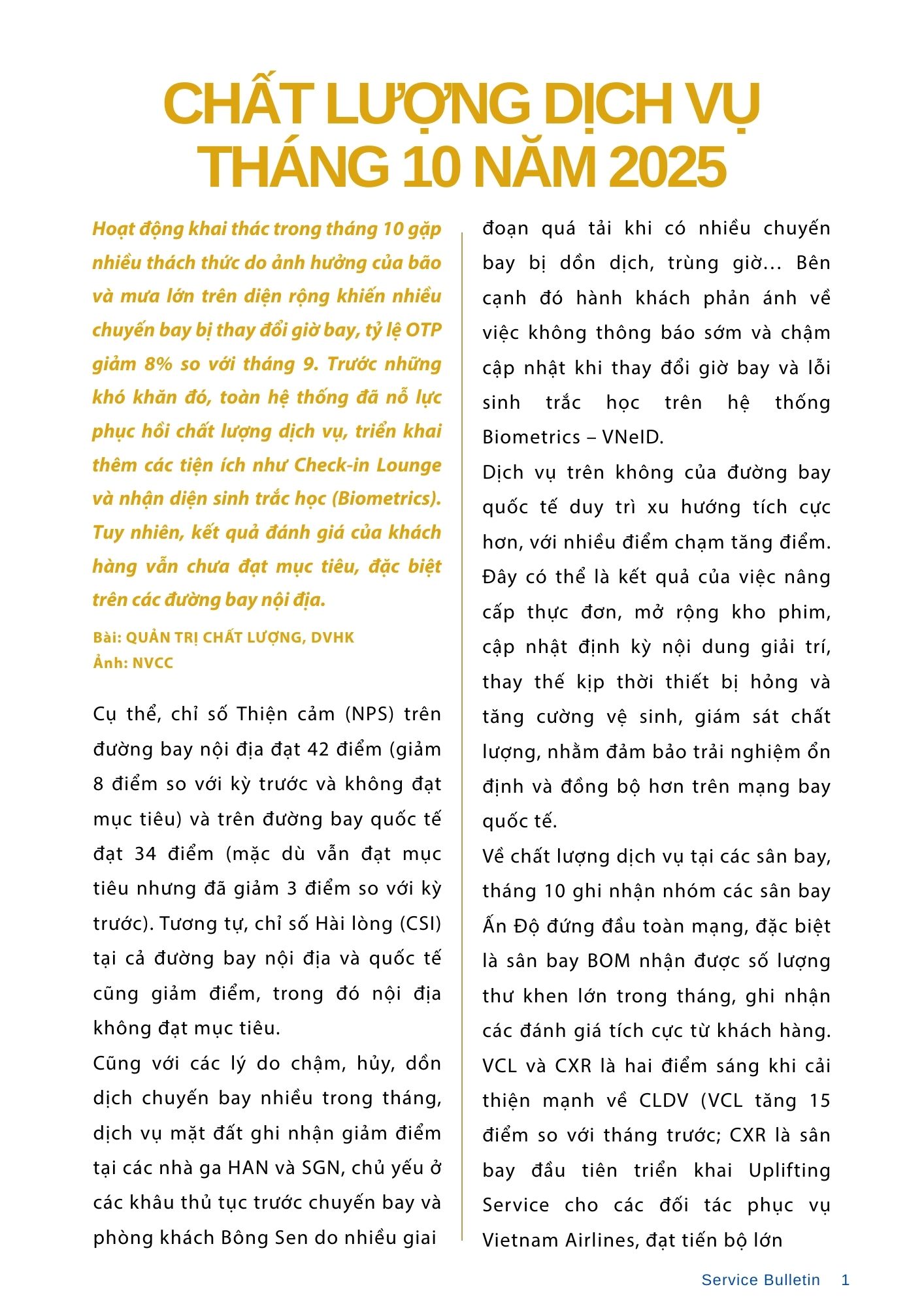 Hoạt động khai thác trong tháng 10 gặp nhiều thách thức do ảnh hưởng của bão và mưa lớn trên diện rộng khiến nhiều chuyến bay bị thay đổi giờ bay, tỷ lệ OTP giảm 8% so với tháng 9. Trước những khó khăn đó, toàn hệ thống đã nỗ lực phục hồi chất lượng dịch vụ, triển khai thêm các tiện ích như Check-in Lounge và nhận diện sinh trắc học (Biometrics). Tuy nhiên, kết quả đánh giá của khách hàng vẫn chưa đạt mục tiêu, đặc biệt trên các đường bay nội địa.
