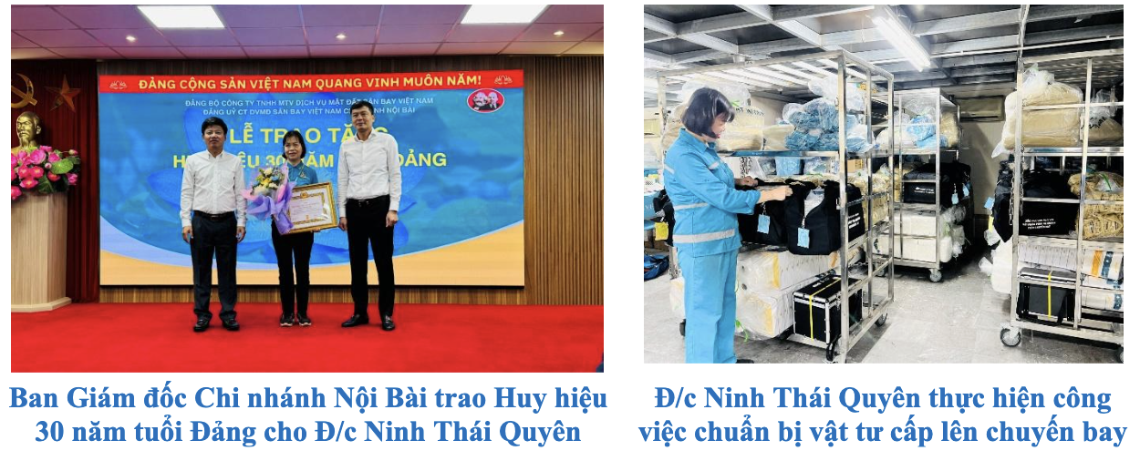 Những cá nhân như đồng chí Ninh Thái Quyên – Nhân viên Kíp Chia vật tư – nhiều năm liền đạt danh hiệu Lao động tiên tiến, luôn nhận ca sớm, sẵn sàng thay ca cho anh chị em, không để cấp sai, cấp thiếu dù chỉ là một tờ khai xuất nhập cảnh, ly giấy hay nút tai… Ngày 07/11/2024, đồng chí Quyên vinh dự được nhận Huy hiệu 30 năm tuổi Đảng. Việc đồng chí Quyên được nhận Huy hiệu Đảng sẽ là tấm gương mẫu mực cho các đảng viên trong Chi bộ noi theo; phát huy kinh nghiệm, bản lĩnh, trí tuệ tiếp tục có những đóng góp to lớn hơn đối với Chi bộ, Đảng bộ Trung tâm PVSĐ, Chi nhánh VIAGS NBA nói riêng và ngành Hàng không nói chung.