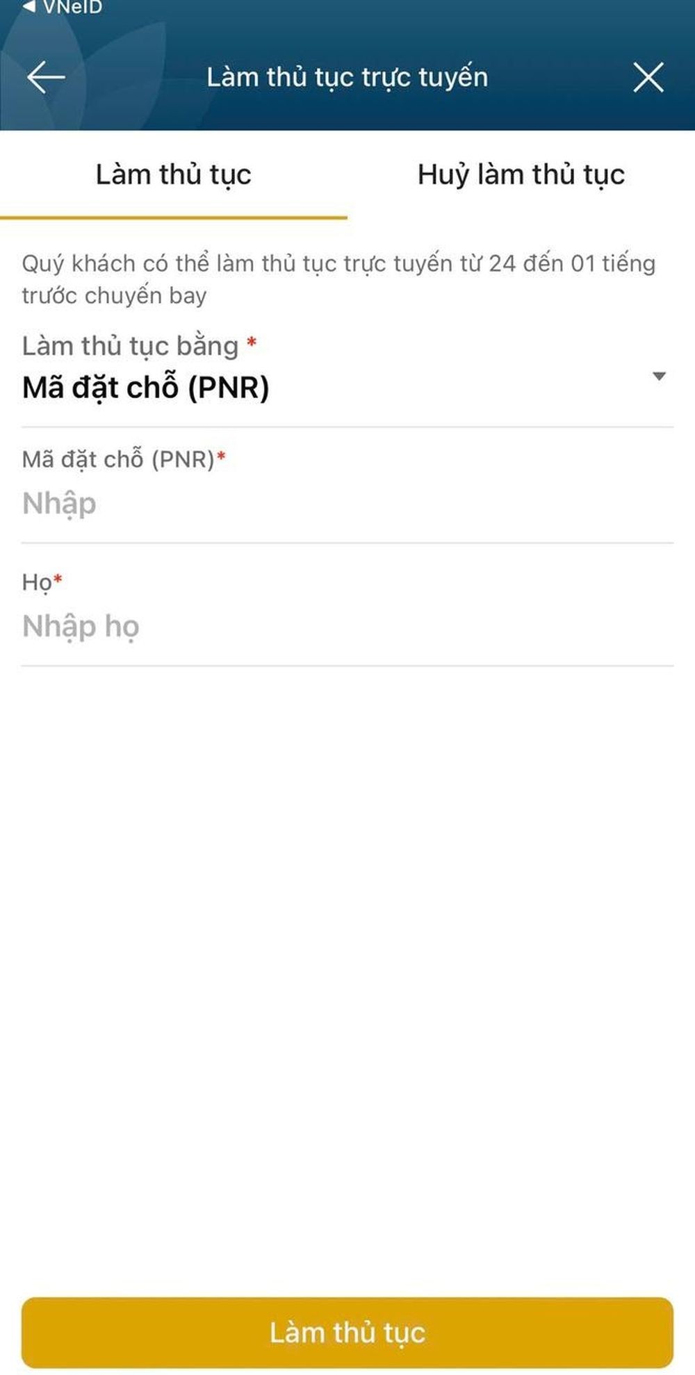 Để làm thủ tục trực tuyến trên VNeID, hành khách cần cài đặt ứng dụng với tài khoản VNeID định danh mức 2. Các bước thực hiện: