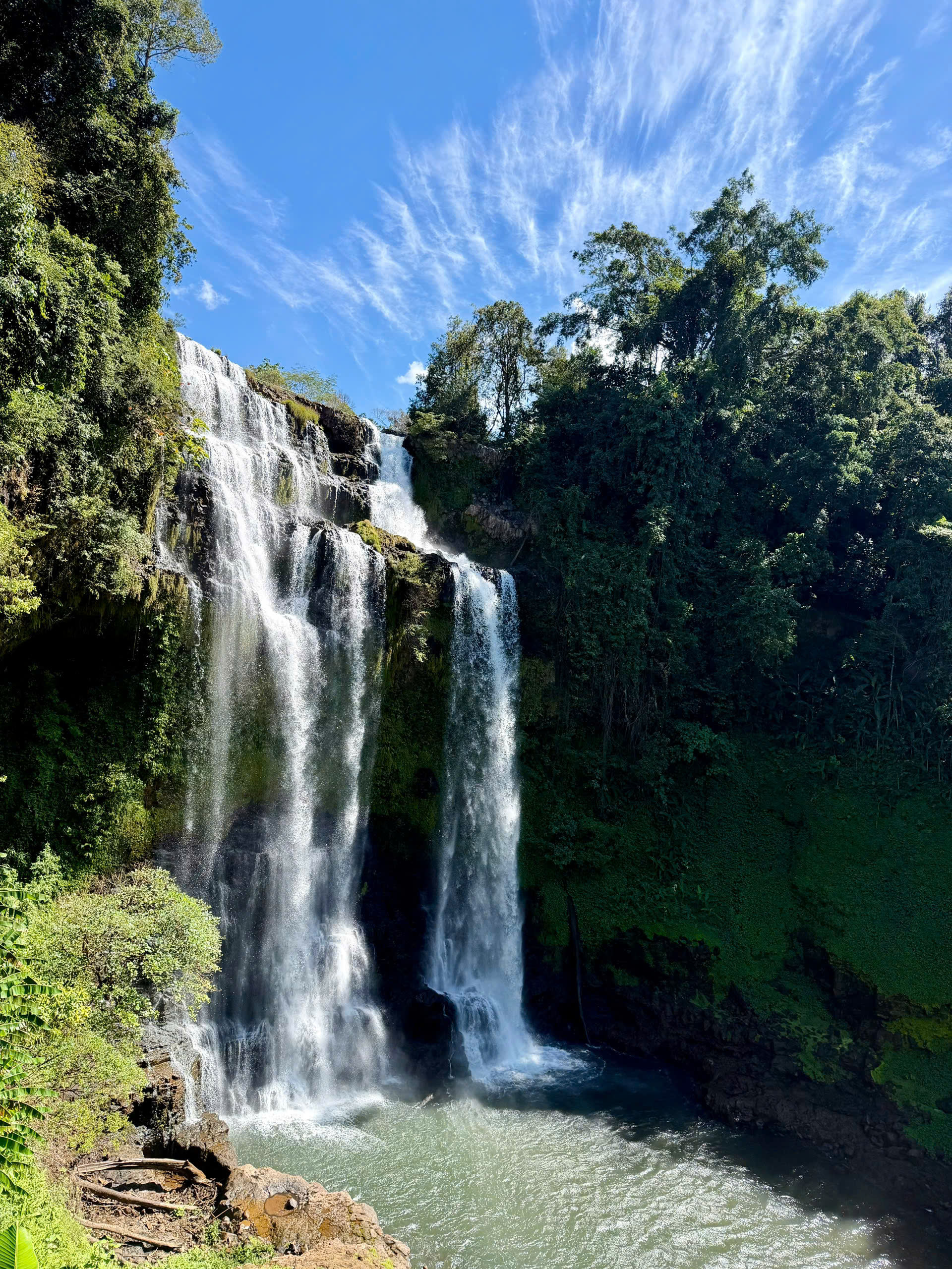 Cao nguyên Bolaven chào đón chúng tôi bằng những tuyệt tác thiên nhiên của mình – thác Tad Fane với dòng thác đôi rơi tự do xuống vực sâu hun hút, và Tad Gneuang, nơi dòng nước trắng xóa đổ tầng tầng lớp lớp giữa thung lũng phủ rêu xanh. Có những khoảnh khắc, để giữ được góc máy mong muốn, chúng tôi phải đứng chơi vơi trên những cây cầu treo lơ lửng, chao đảo trước sức nặng của người đi, gió và sương thổi mờ cả ống kính; nhiều người chọn trượt zipline để tác nghiệp, ghi lại hình ảnh thác từ trên cao. Mệt, hồi hộp, nhưng mỗi bức hình thu về đều khiến tim ngập tràn phấn khích.