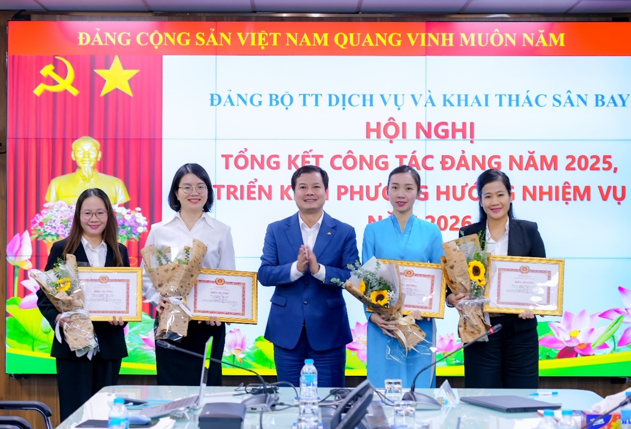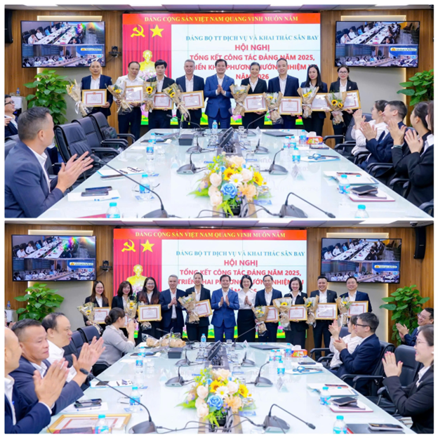 Trong khuôn khổ Hội nghị Tổng kết công tác Đảng năm 2025, Đảng ủy Trung tâm Dịch vụ và Khai thác sân bay (ASOC) đã tổ chức trao bằng khen cho các tập thể và cá nhân tiêu biểu có thành tích xuất sắc trong thực hiện nhiệm vụ chính trị năm 2025 nhằm kịp thời ghi nhận, biểu dương các tập thể chi bộ và đảng viên đã phát huy tinh thần trách nhiệm, tính tiên phong, gương mẫu, hoàn thành xuất sắc nhiệm vụ được giao, góp phần quan trọng vào kết quả chung của Đảng bộ trong năm qua.