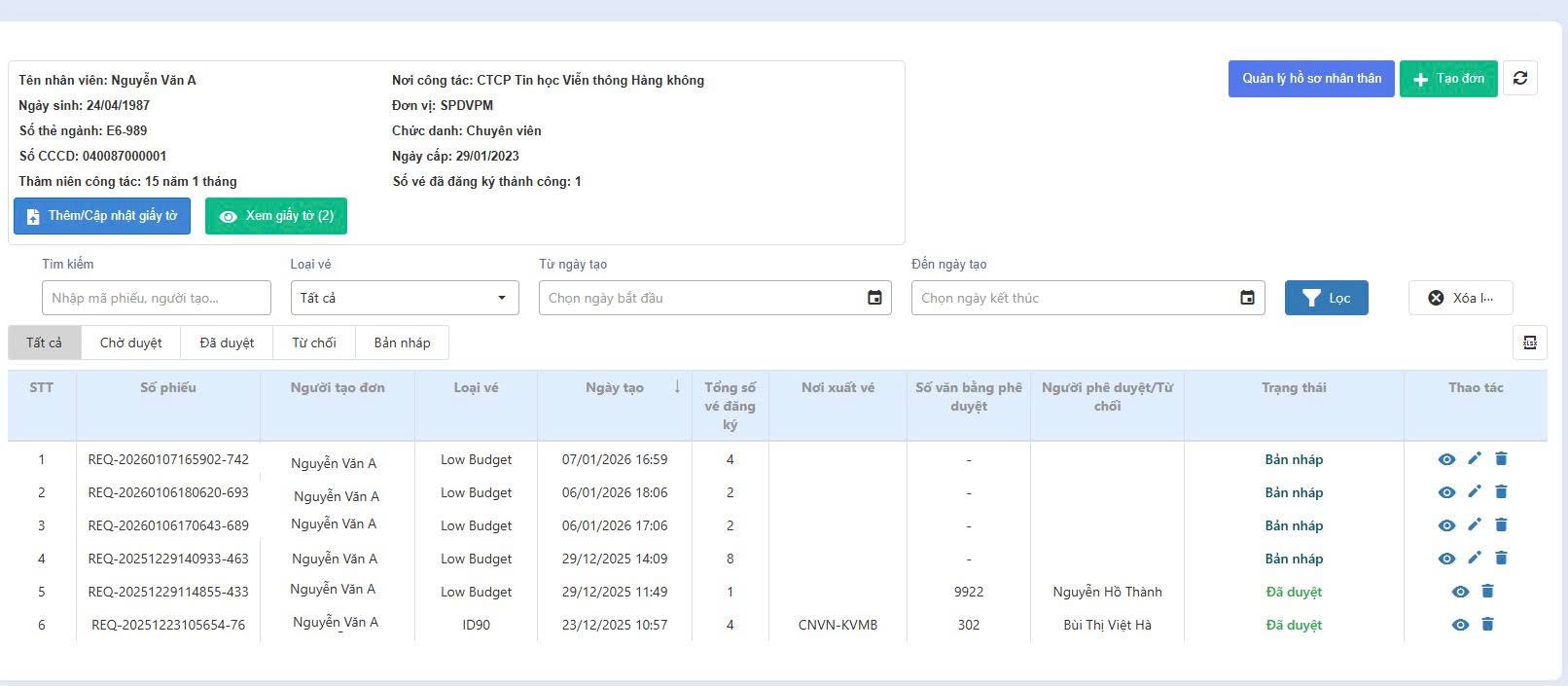 Đối với Cán bộ nhân viên, hệ thống cho phép chủ động đăng ký vé ưu đãi trực tuyến, dễ dàng cập nhật và quản lý thông tin, hồ sơ nhân thân theo quy định, đồng thời theo dõi tiến trình xử lý ngay trên a.Office.