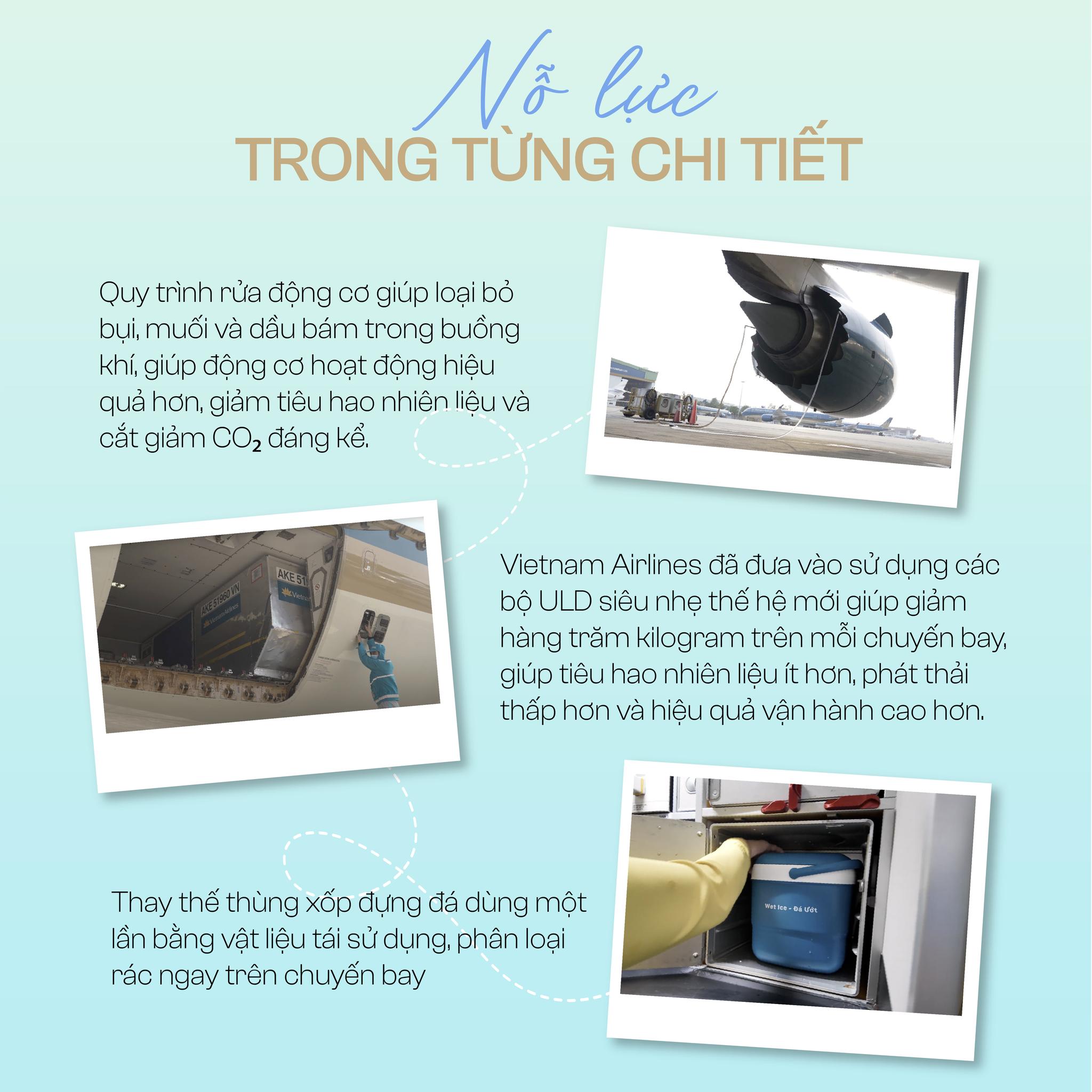 Vietnam Airlines áp dụng quy trình rửa khô động cơ, giúp loại bỏ bụi, muối và dầu bám trong buồng khí trong mảng kỹ thuật. Giải pháp này giúp động cơ hoạt động hiệu quả hơn, giảm tiêu hao nhiên liệu và cắt giảm đáng kể lượng khí CO₂ phát thải.