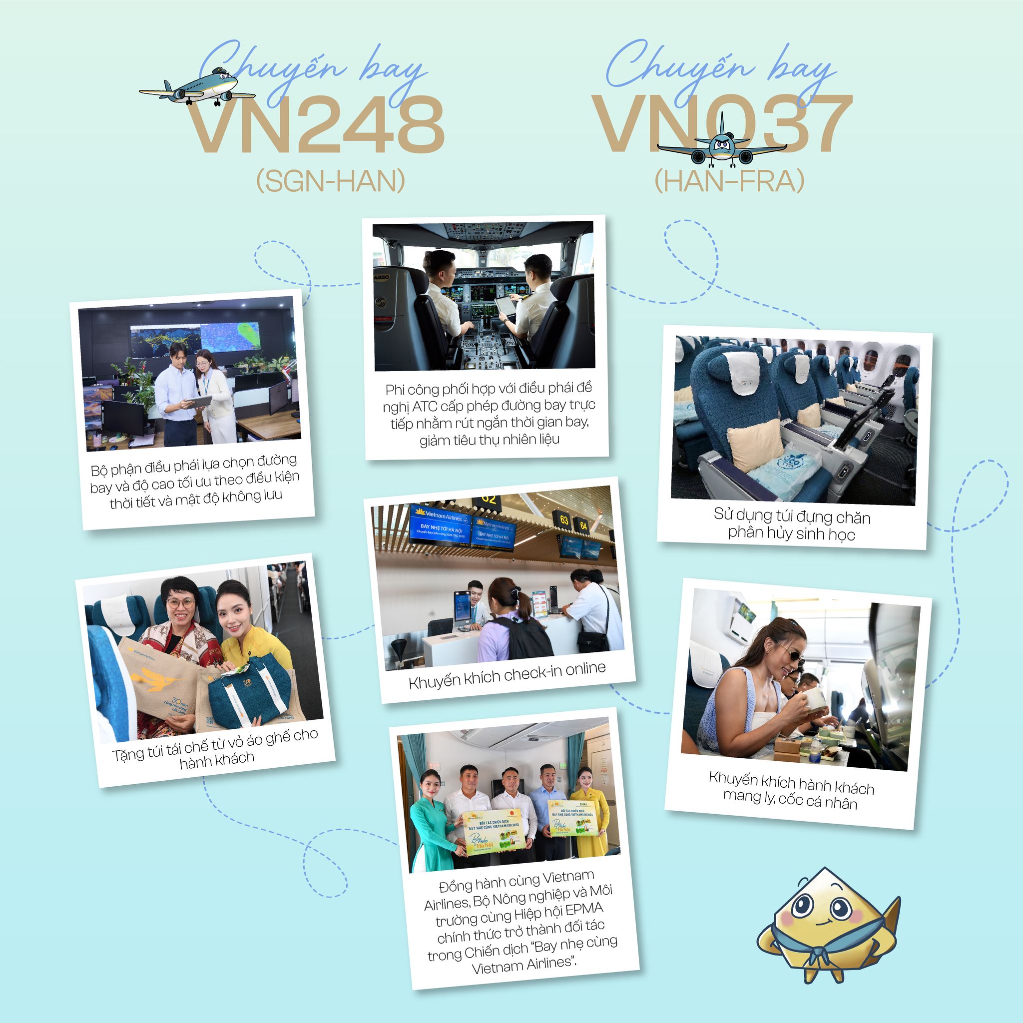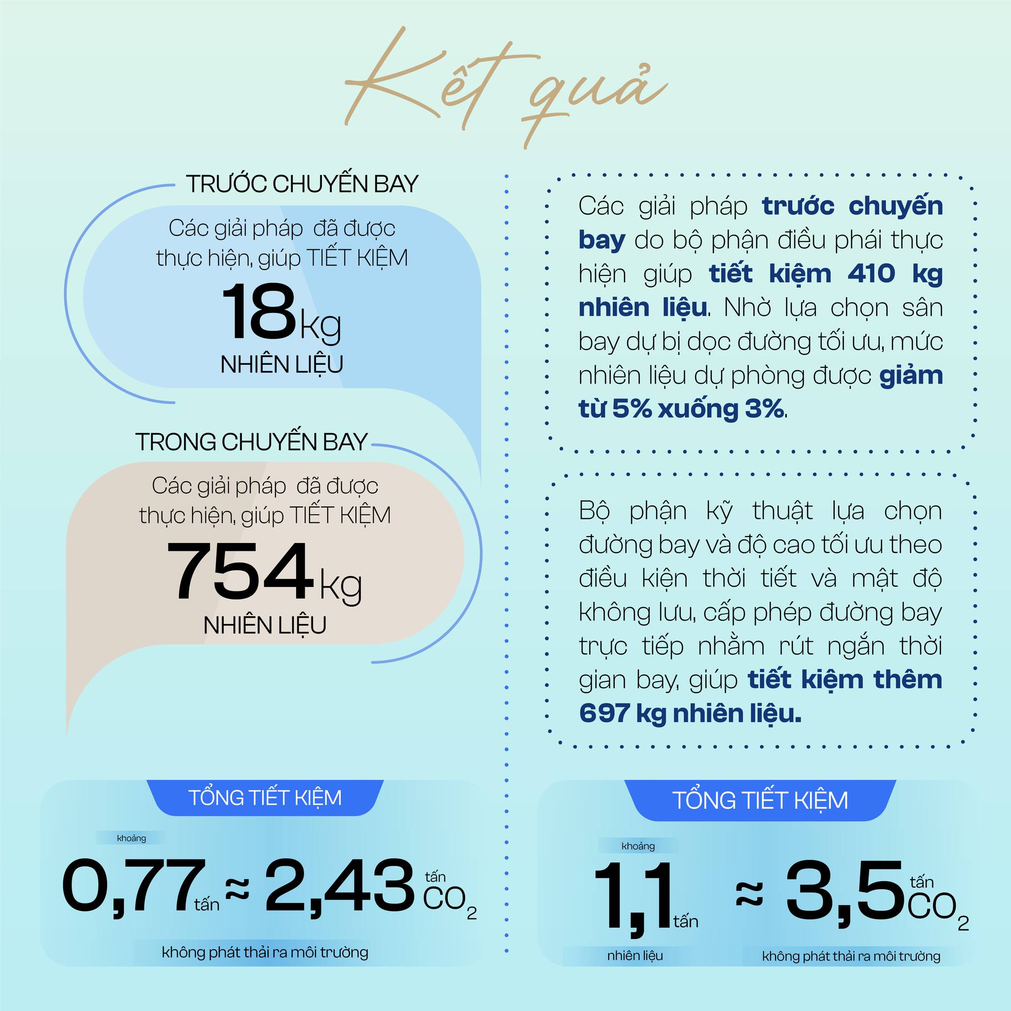 Trên chuyến bay VN248 (TP. Hồ Chí Minh – Hà Nội), các biện pháp trước chuyến bay giúp tiết kiệm 18kg nhiên liệu và tiết kiệm thêm 754kg nhiên liệu trong chuyến bay. Tổng cộng, chuyến bay đã tiết kiệm 0,77 tấn nhiên liệu, tương đương 2,43 tấn CO₂ không phát thải ra môi trường.