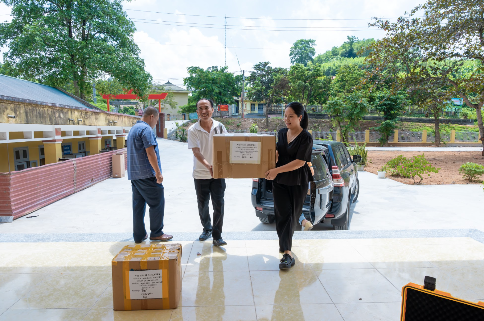 Nhân viên của Vietnam Airlines không chỉ trao đi món quà, mà còn trực tiếp tham gia vào công việc hậu trường như lắp đặt thư viện, sắp xếp từng cuốn sách ngay ngắn trên kệ, treo banner rực rỡ để chuẩn bị cho sự kiện đặc biệt. Hình ảnh ấy đã tạo nên bức tranh ấm áp về sự sẻ chia, về tinh thần gắn kết giữa Vietnam Airlines và cộng đồng.