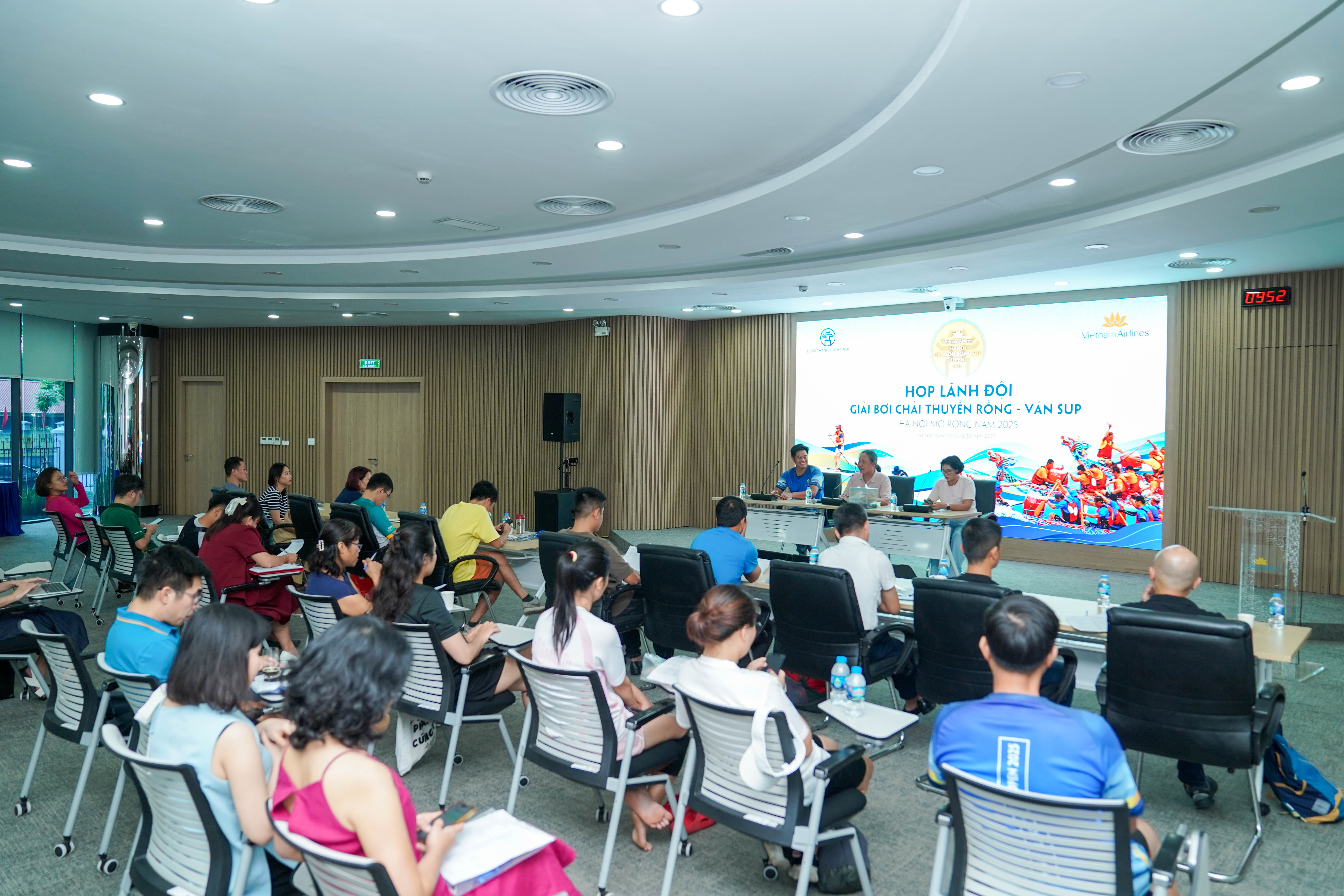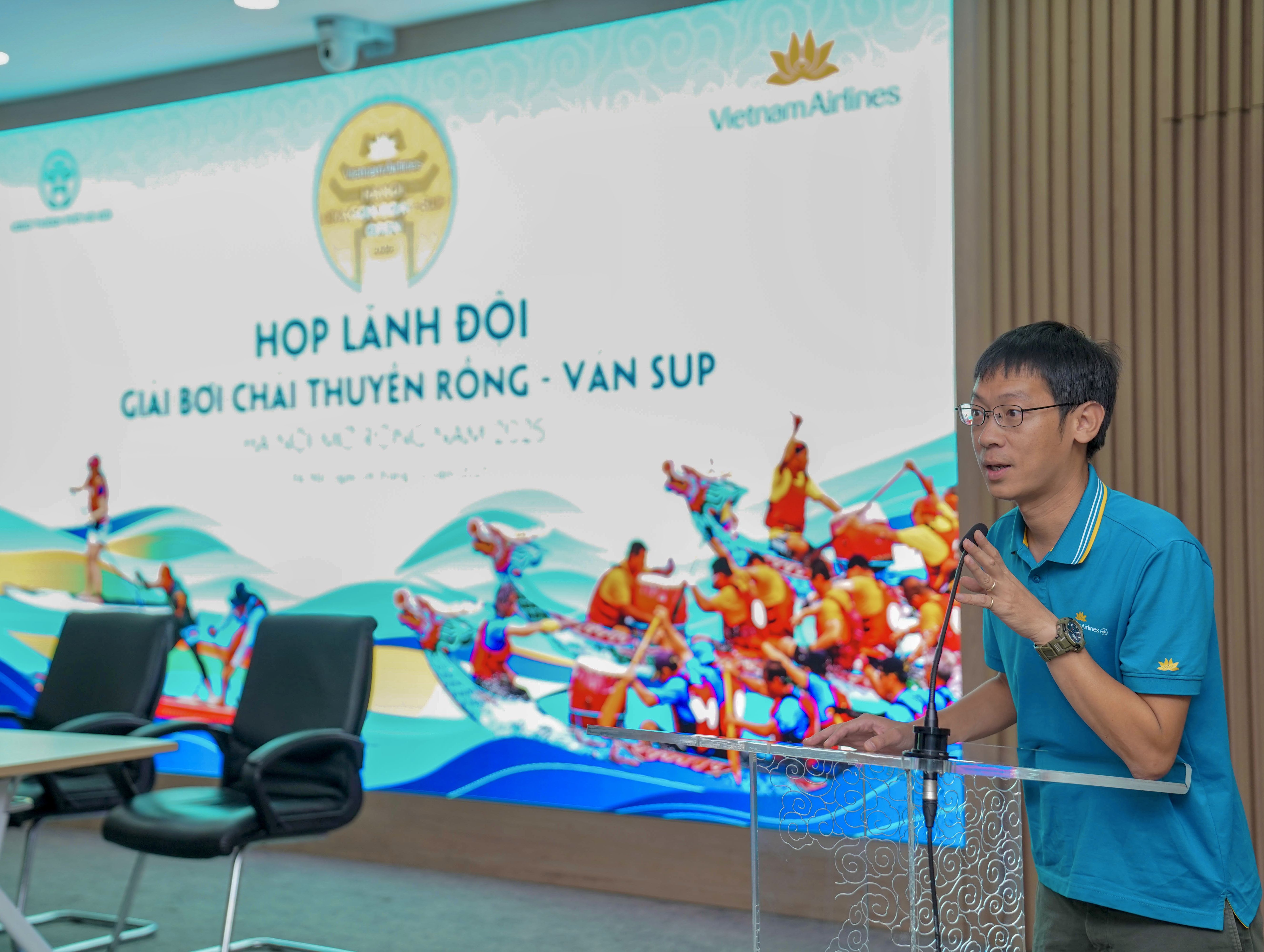 Phát biểu khai mạc tại cuộc họp, đại diện cho Vietnam Airlines, ông Lê Minh Tuấn – Phó Trưởng phòng Truyền thông nhấn mạnh, Giải Bơi chải Thuyền rồng – Ván SUP Hà Nội mở rộng 2025 lễ hội vừa là một hoạt động thể thao – văn hóa đặc sắc, vừa là nơi hội tụ tinh thần đoàn kết, ý chí vươn lên và niềm tự hào của cộng đồng. Ông nêu rõ Vietnam Airlines, với vai trò đồng chủ trì cùng UBND TP. Hà Nội, vinh dự đồng hành để khẳng định bản sắc văn hóa, đồng thời góp phần đưa bạn bè và du khách đến gần hơn với vẻ đẹp mùa thu Hà Nội trong khuôn khổ chiến dịch “Chạm thu Hà Nội”.