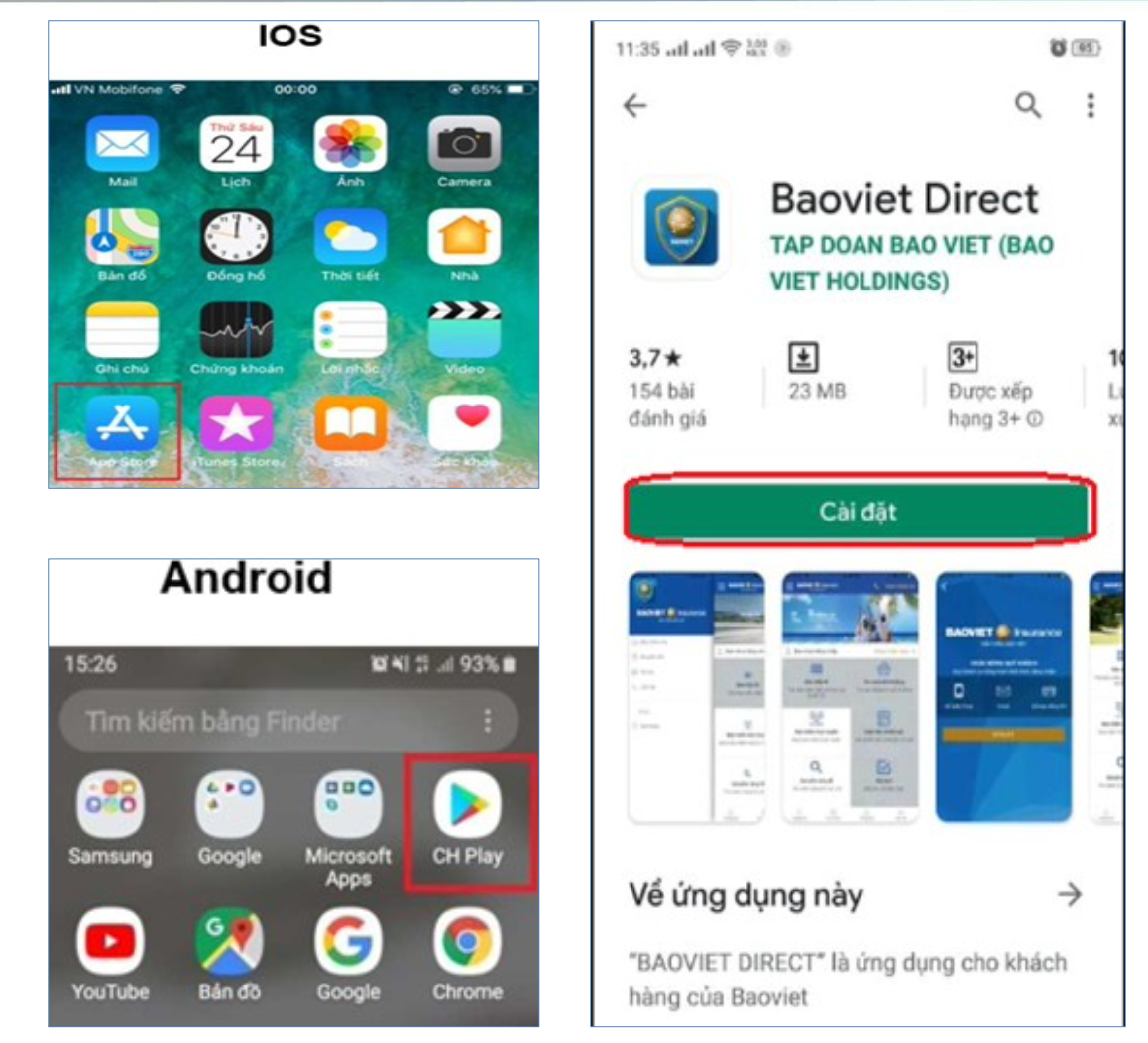 Bước 1: Truy cập App Store (đối với iOS) hoặc CH Play (đối với Android) và tìm kiếm ứng dụng Bảo Việt Direct để cài đặt.