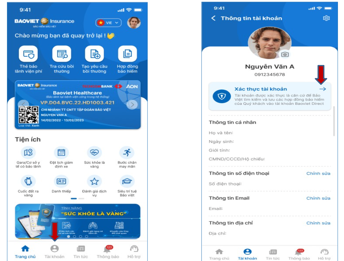 Bước 1: Vào chức năng xác thực: Từ màn hình chính, vào tab “Tài khoản” → Chọn mũi tên ở mục “Xác thực tài khoản”.