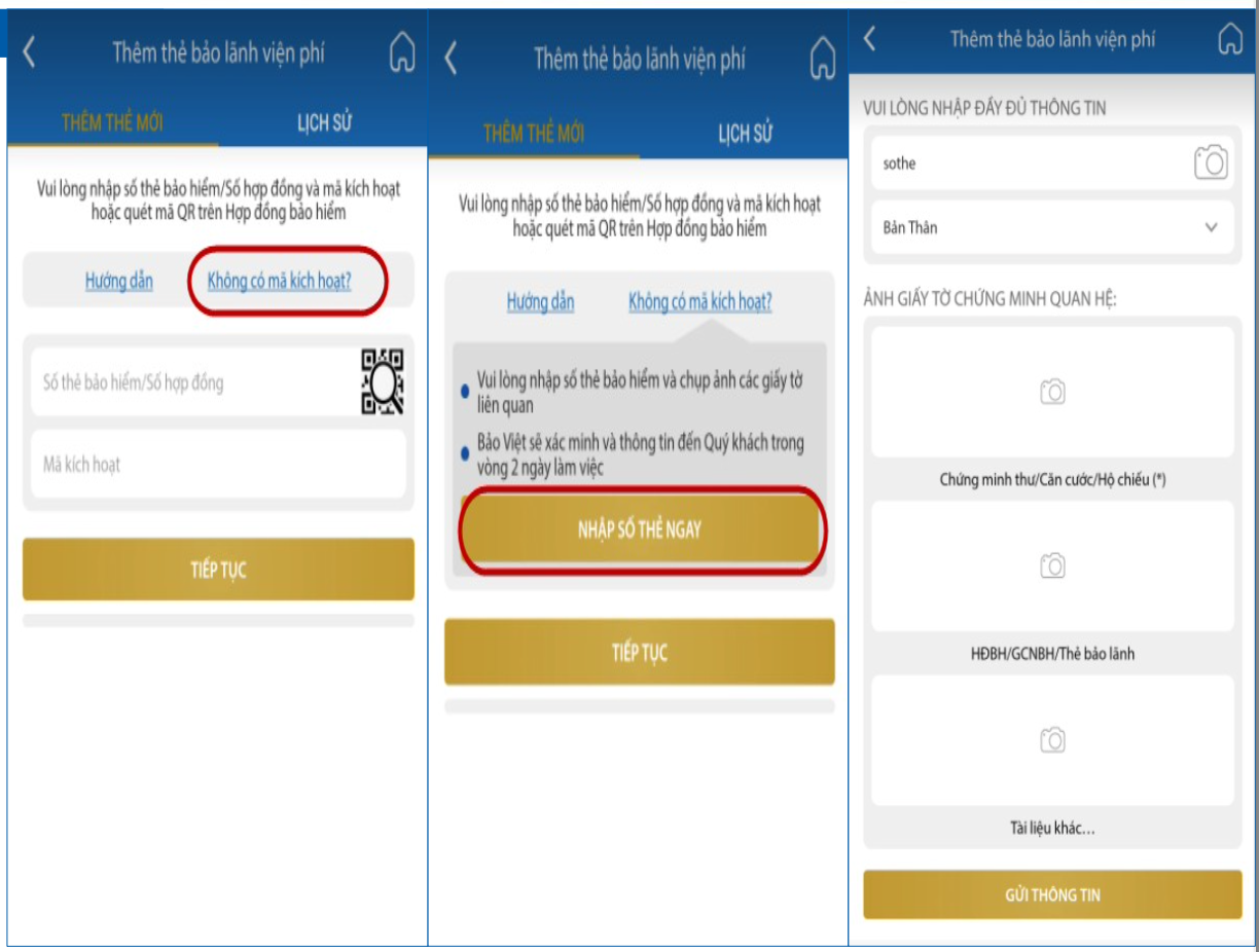 Bước 3: Không có mã kích hoạt: Vào chức năng “Thêm thẻ” → Chọn “Không có mã kích hoạt” → Nhập số thẻ và mối quan hệ với NĐBH → Đính kèm giấy tờ chứng minh → Gửi thông tin. Bảo hiểm Bảo Việt sẽ phản hồi trong 1 ngày làm việc.